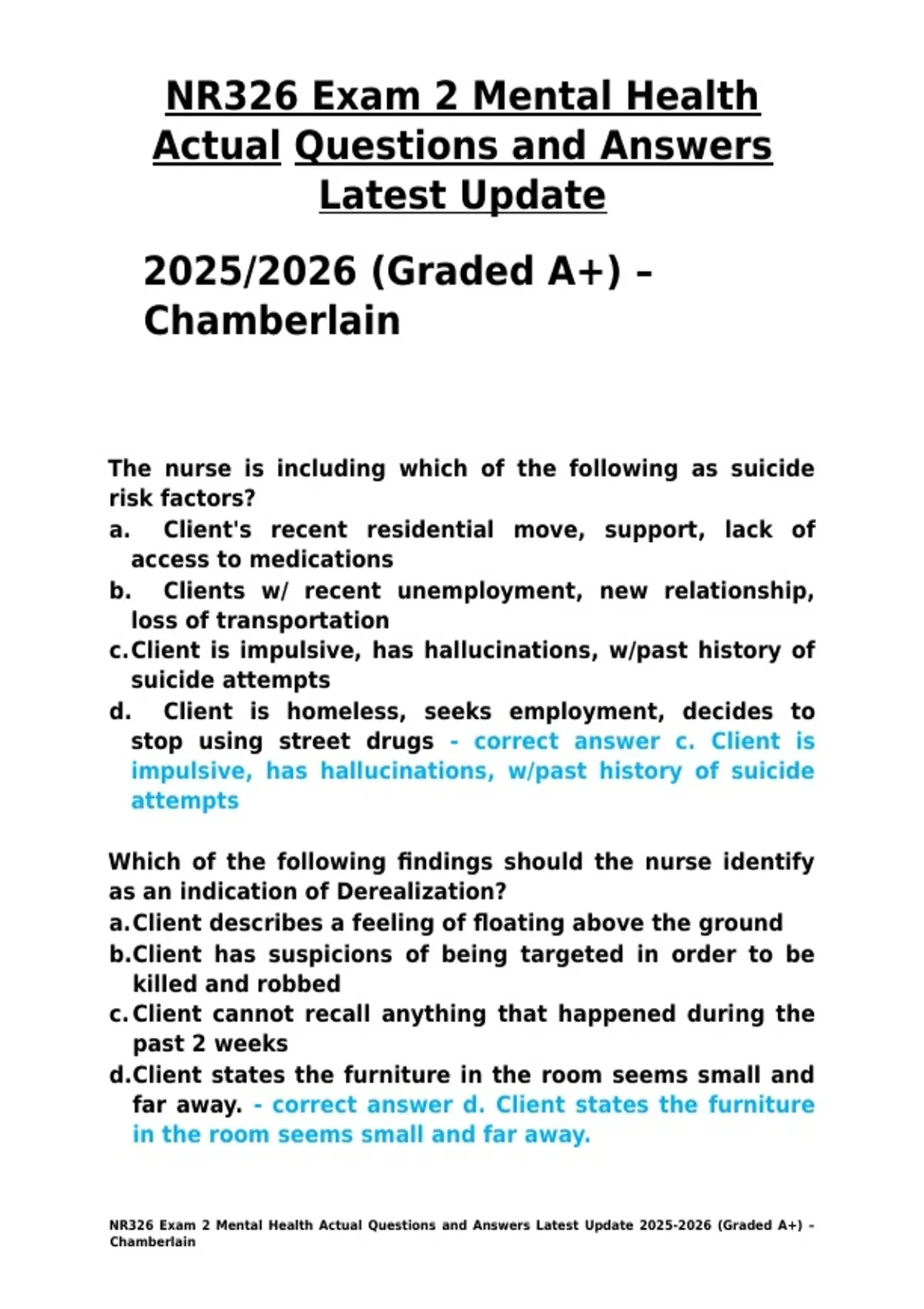 NR326 Exam 2 Mental Health Actual Questions and Answers Latest Update 2025-2026 (Graded A+) –