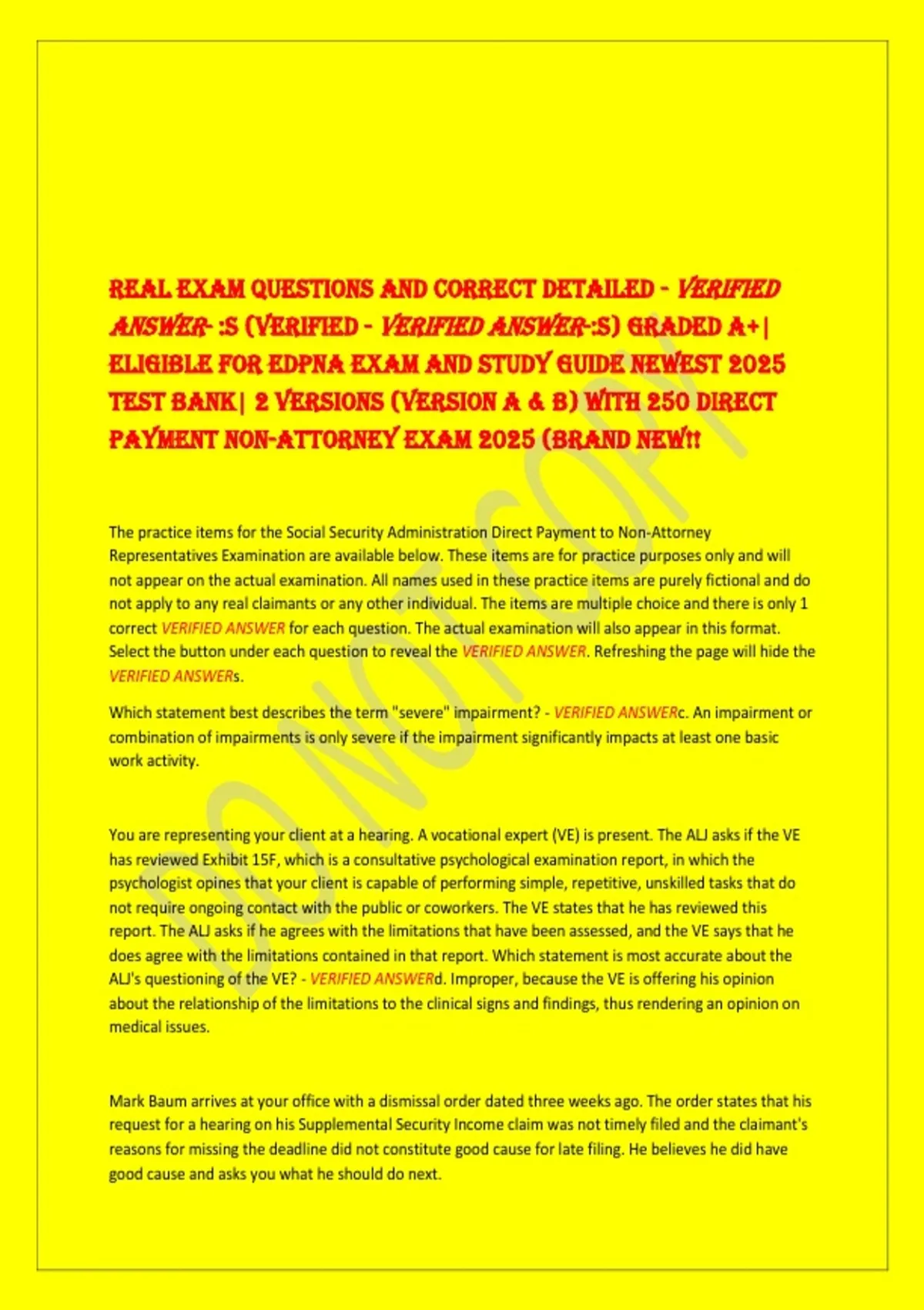 REAL EXAM QUESTIONS AND CORRECT DETAILED - VERIFIED ANSWER- :S (VERIFIED - VERIFIED ANSWER-:S) GRADED A+| ELIGIBLE FOR EDPNA EXAM AND STUDY GUIDE NEWEST 2025 TEST BANK| 2 VERSIONS (VERSION A & B) WITH 250 DIRECT PAYMENT NON-ATTORNEY EXAM 2025 (BRAND NEW!!
