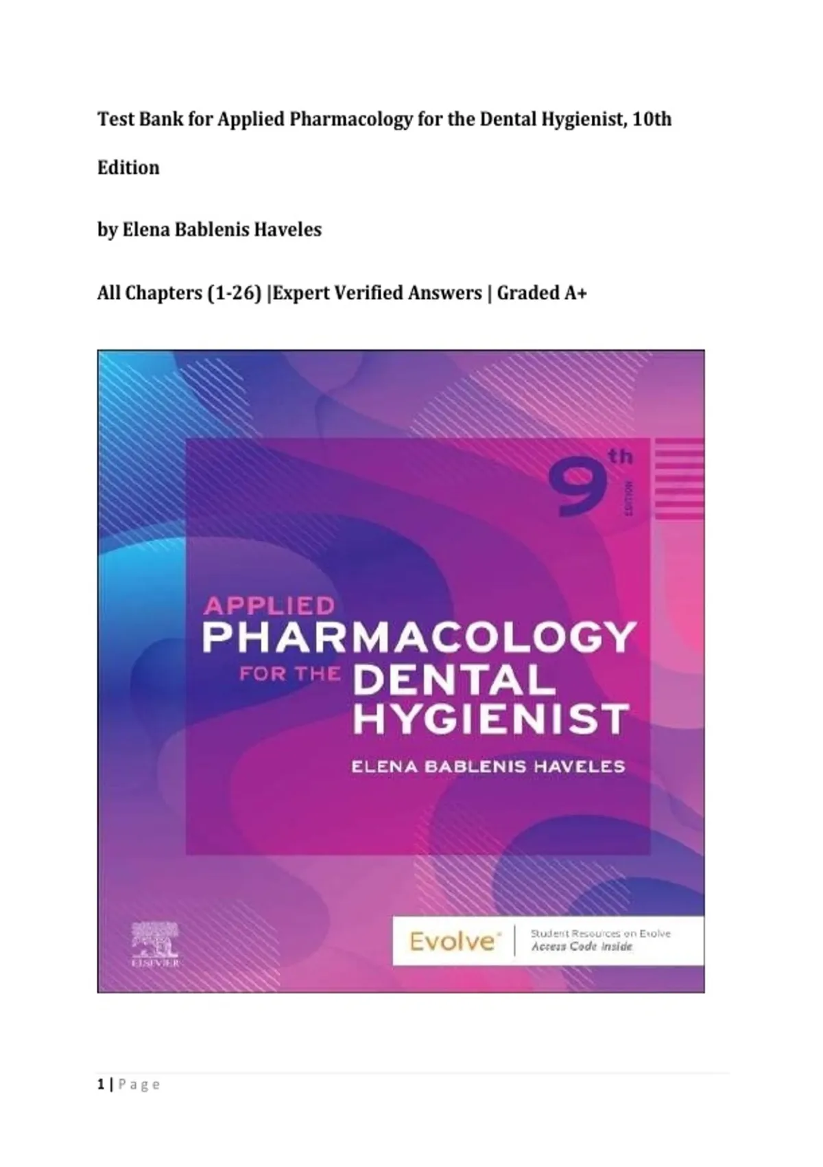 Applied Pharmacology for the Dental Hygienist – Test Bank (10th Edition) by Elena Bablenis Haveles | All Chapters 1–26 | Expert-Verified Answers | Graded A+