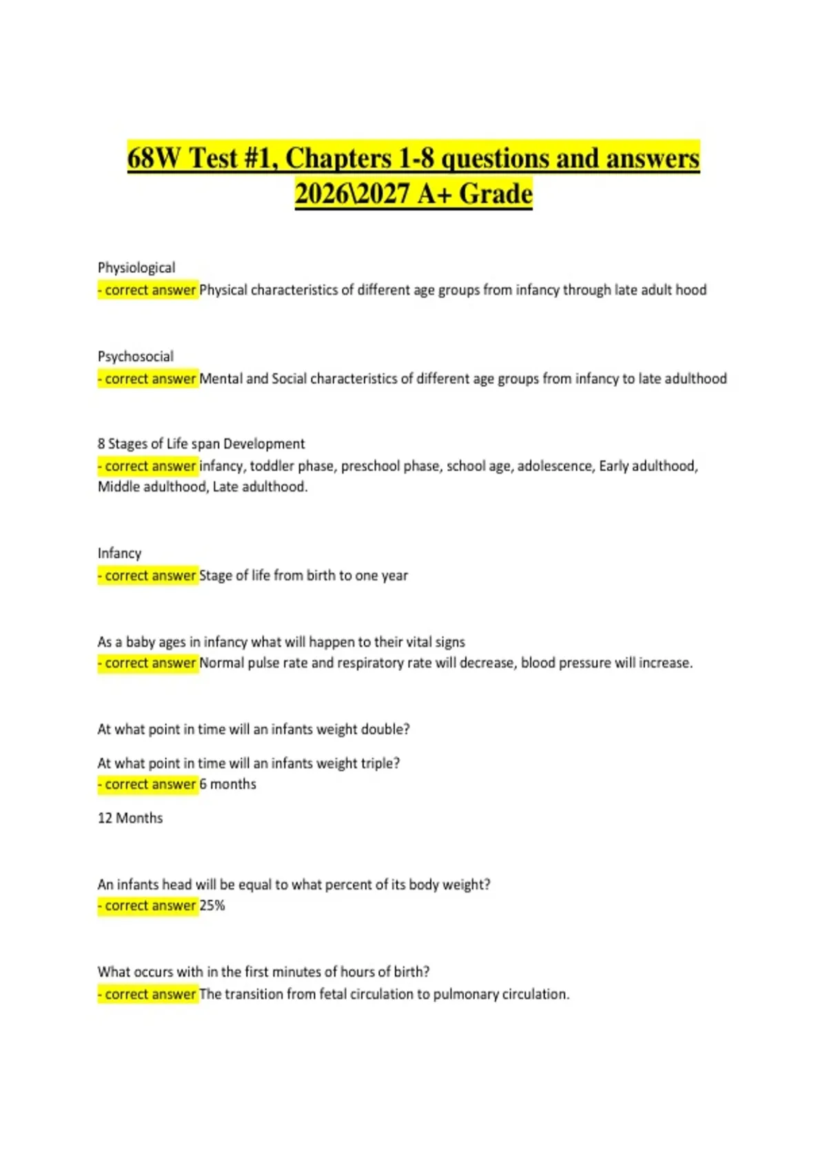 This study guide is designed for 68W Test #1 covering Chapters 1–8 and focuses on foundational Combat Medic training topics such as roles and responsibilities of the 68W, medical terminology, patient assessment, vital signs, infection control, documentation, safety procedures, and basic emergency care principles. It includes exam-style questions with clear, accurate answers to support effective preparation for the 2026–2027 training cycle. The material is structured to reinforce core knowledge, improve test readiness, and help learners achieve an A+ grade.