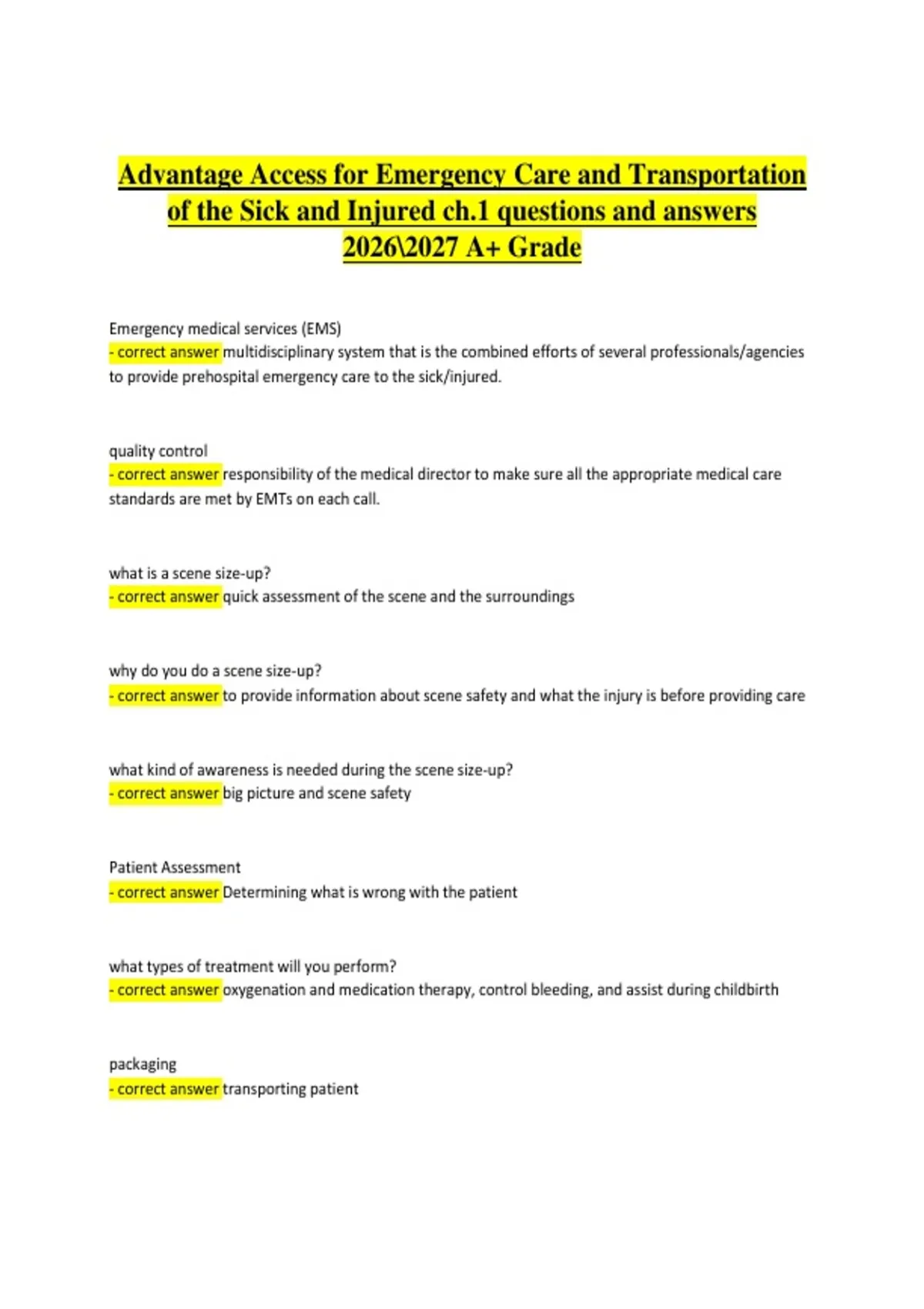 This study guide covers Chapter 1 of Advantage Access for Emergency Care and Transportation of the Sick and Injured, focusing on the EMS system, roles and responsibilities of EMS providers, levels of training, medical direction, legal and ethical considerations, and professionalism in emergency care. It includes chapter-aligned questions with clear, accurate answers to support effective preparation for EMT coursework and exams during the 2026–2027 academic year. The material is structured to reinforce foundational EMS knowledge, critical thinking, and exam readiness, helping students achieve an A+ grade.