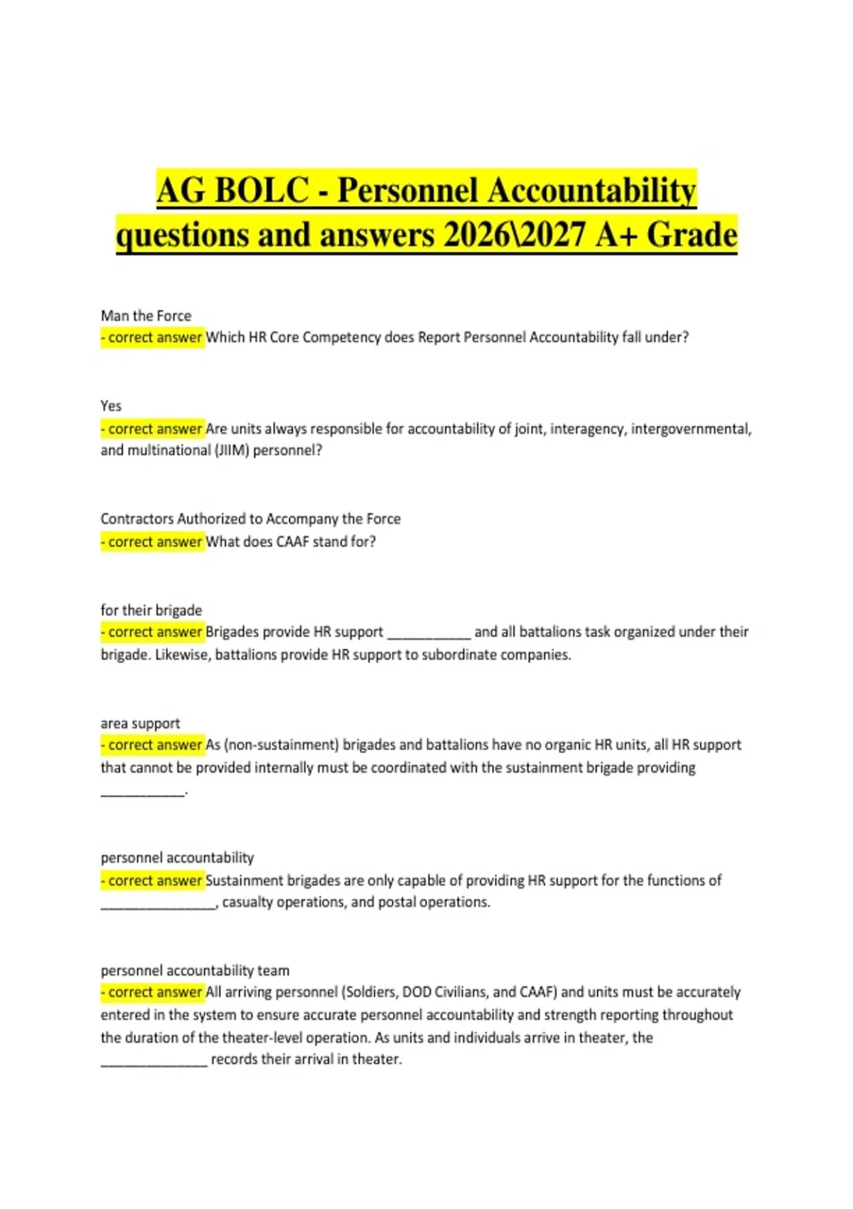 This study guide is designed for AG BOLC Personnel Accountability and covers key concepts such as Army accountability systems, strength reporting, duty status codes, casualty reporting, personnel readiness, HR metrics, and the roles and responsibilities of S1 operations. It includes exam- and training-aligned questions with clear, accurate answers to support effective preparation for the 2026–2027 training cycle. The material is structured to reinforce doctrinal understanding, operational accuracy, and exam readiness, helping officers achieve an A+ grade.