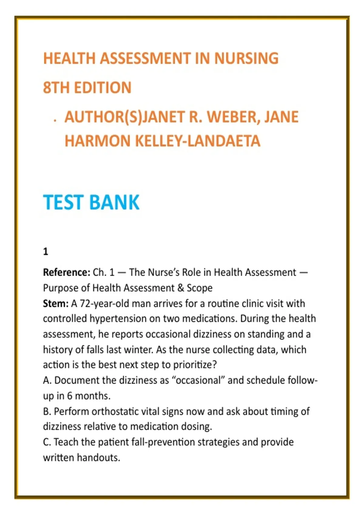 Health Assessment Nursing Test Bank 2026 | Weber & Kelley-Landaeta | Physical Assessment MCQs | Nursing Test Bank 2) SEO Product Description (200–300 words) Master nursing health assessment with this comprehensive Nursing Test Bank 2026 aligned to Health Assessment in Nursing, 8th Edition by Janet R. Weber and Jane Harmon Kelley-Landaeta—a cornerstone text in undergraduate and advanced nursing education. This digital test bank delivers full textbook coverage across all units and chapters, with 20 NCLEX-style multiple-choice questions per chapter, each supported by clear, evidence-based rationales. Questions are designed to strengthen clinical judgment, diagnostic reasoning, and accurate interpretation of assessment findings, not rote memorization. Every item is built around realistic patient scenarios that integrate health history, head-to-toe physical examination, normal vs. abnormal findings, documentation, and therapeutic communication. The result is a time-efficient study tool that reinforces core assessment concepts while preparing learners for written exams, skills labs, OSCEs, and NCLEX clinical judgment expectations. This test bank is ideal for students and educators in: Health Assessment in Nursing Physical Examination & Diagnostic Reasoning Advanced Health Assessment (BSN / MSN / DNP) Clinical Skills & Patient Assessment Labs NCLEX-RN® clinical judgment preparation Key Features: Full-chapter coverage of Health Assessment in Nursing (8th Edition) 20 high-quality, assessment-focused MCQs per chapter Correct answers with concise, nursing-specific rationales Emphasis on clinical reasoning and safety-focused decision-making Designed for exam success and real-world assessment accuracy Built on the trusted framework of Weber & Kelley-Landaeta, this Nursing Test Bank supports confident, competent patient assessment from classroom to clinical practice. 3) 8 High-Value SEO Keywords health assessment nursing test bank weber kelley landaeta test bank physical assessment nursing mcqs nursing health assessment questions advanced health assessment test bank nclex assessment practice questions head to toe assessment nursing test bank nursing physical examination mcqs 4) 10 SEO-Optimized Hashtags #HealthAssessmentNursing #NursingTestBank #PhysicalAssessmentMCQs #NCLEXClinicalJudgment #NursingEducationResources #HeadToToeAssessment #AdvancedHealthAssessment #NursingExamPrep #ClinicalSkillsNursing #AssessmentBasedLearning