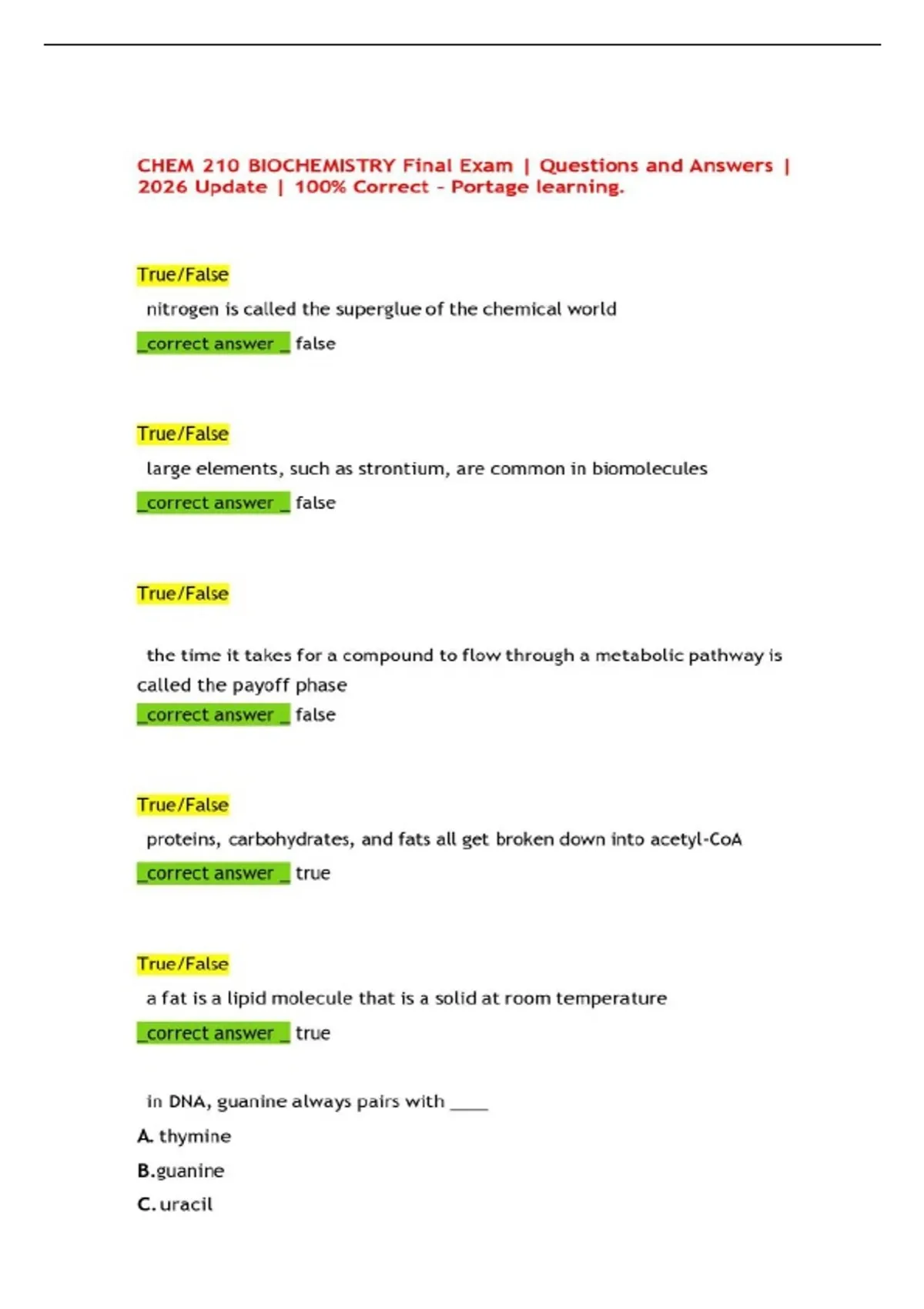 CHEM 210 BIOCHEMISTRY Final Exam | Questions and Answers | 2026 Update | 100% Correct – Portage learning.