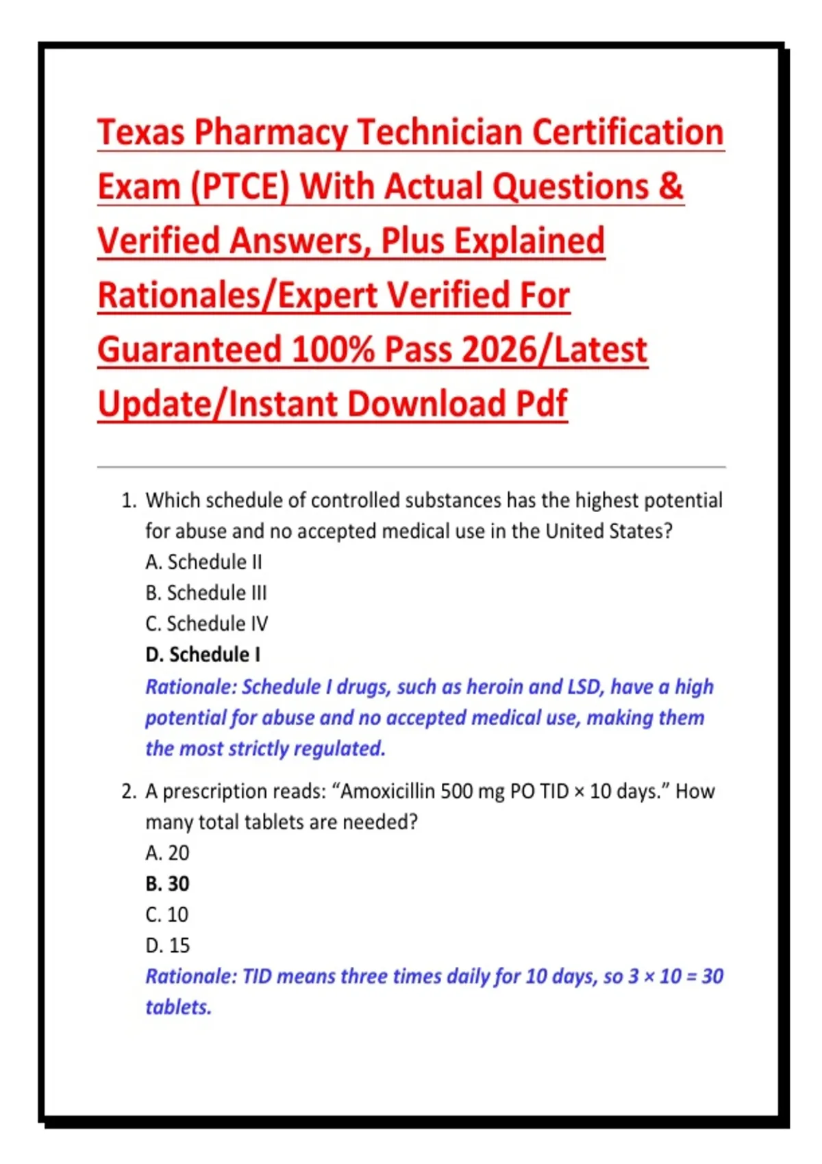2. A prescription reads: “Amoxicillin 500 mg PO TID × 10 days.” How
