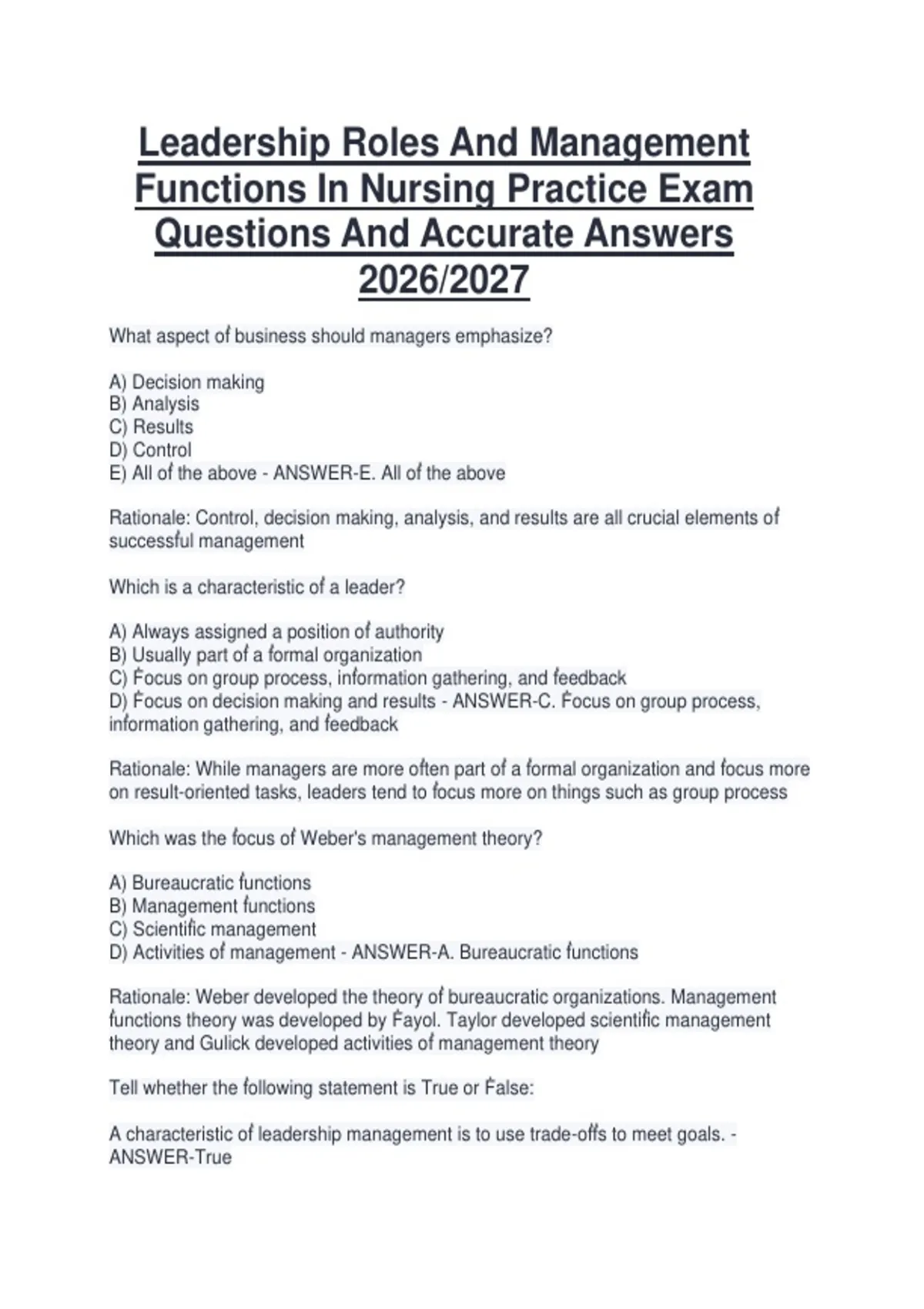 Leadership Roles And Management Functions In Nursing Practice Exam Questions And Accurate Answers 2026/2027