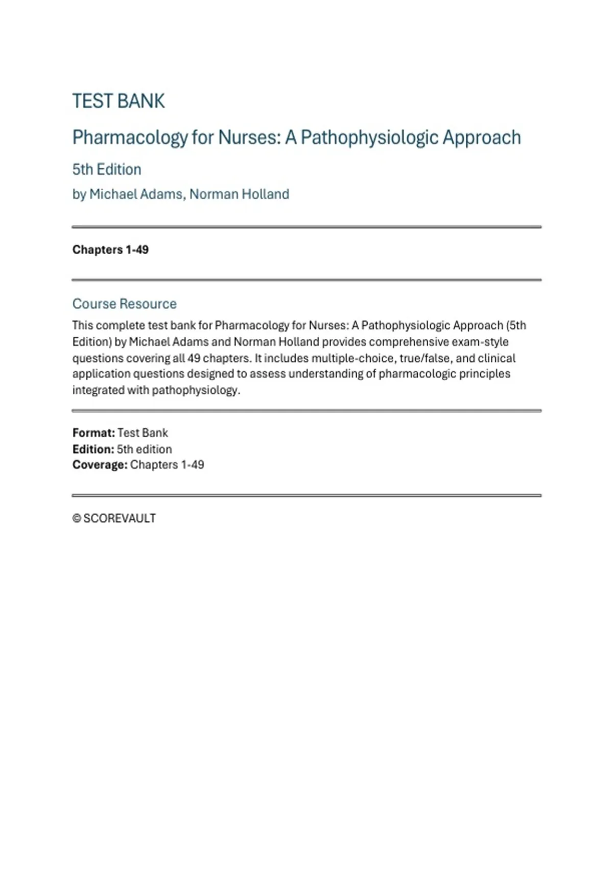 Pharmacology for Nurses: A Pathophysiologic Approach (5th Edition, Michael P. Adams & Norman M. Holland) — Complete Test Bank (Chapters 1–49)