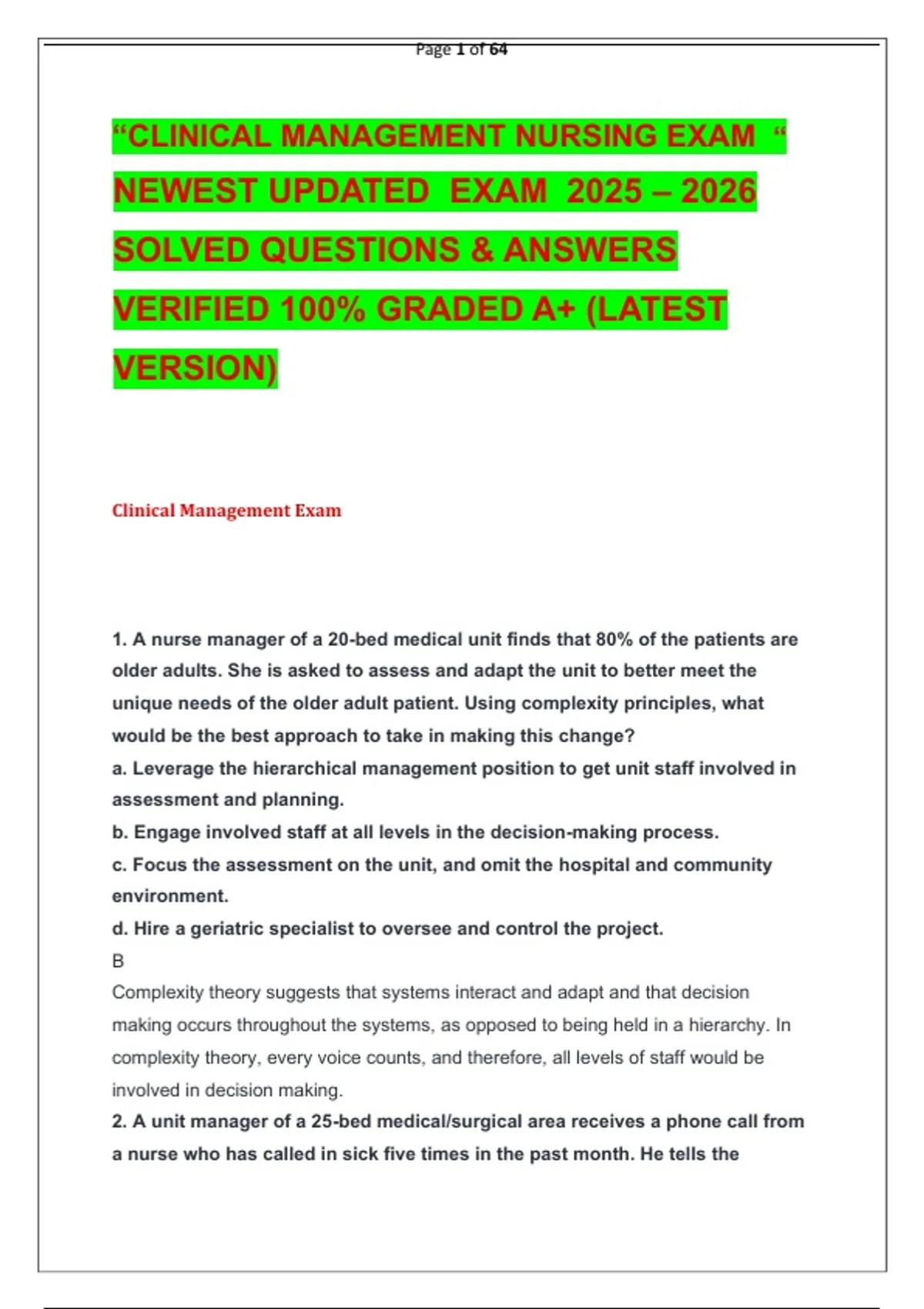 “CLINICAL MANAGEMENT NURSING EXAM “