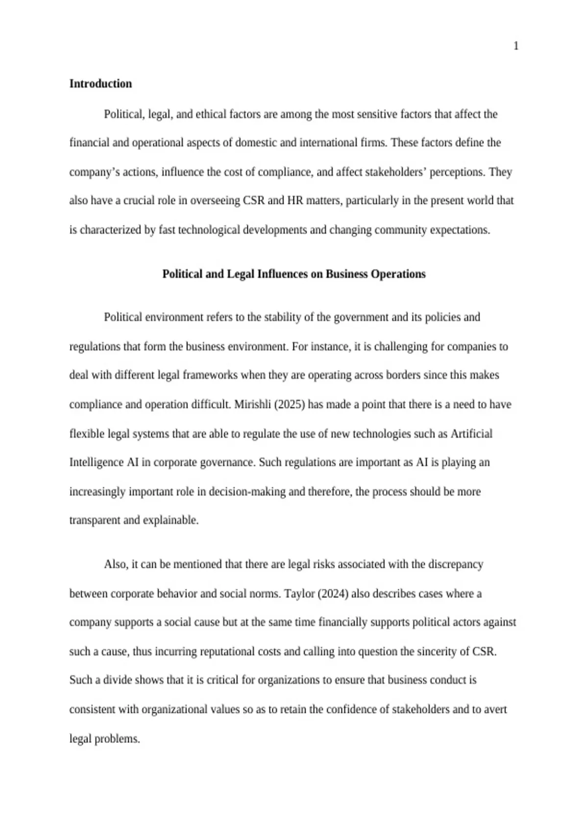 Prompt: Legal and regulatory issues relate to differences in laws and regulations for both domestic and multinational companies. Instructions: In a 650-700 content words paper, discuss how political, legal, and ethical issues can affect the financial and business operations of a company. How does this impact Corporate Social Responsibility (CSR) activities and Human Resources (HR) departments? APA7 and Turnitin are required. Include a minimum of 5 references.