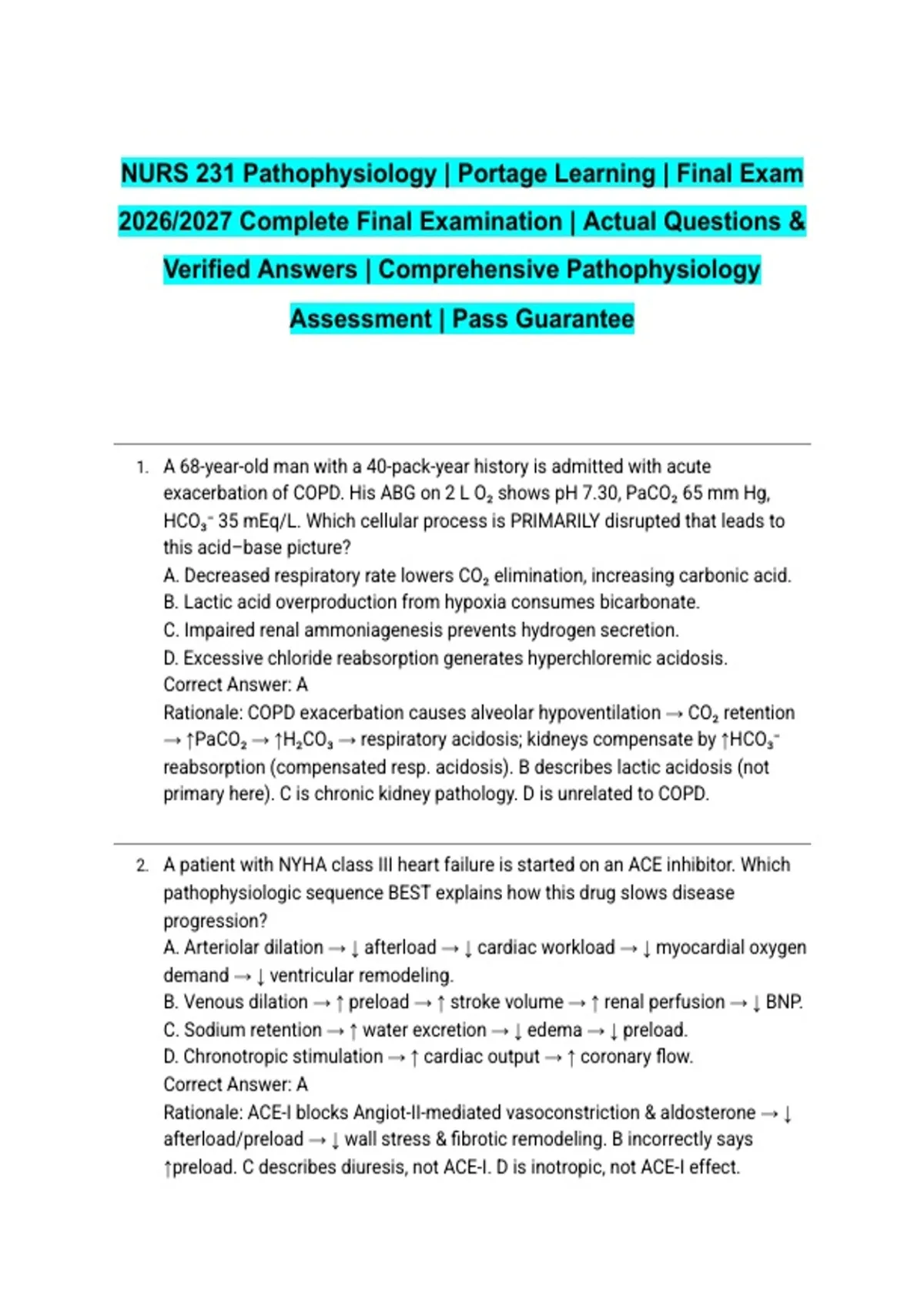 NURS 231 Pathophysiology | Portage Learning | Final Exam 2026/2027 Complete Final Examination | Actual Questions & Verified Answers | Comprehensive Pathophysiology Assessment | Pass Guarantee