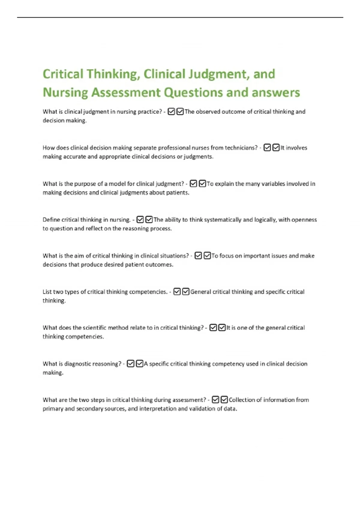 Critical Thinking, Clinical Judgment, and Nursing Assessment Questions and answers What is clinical judgment in nursing practice? - The observed outcome of critical thinking and decision making. How does clinical decision making separate professional nurses from technicians? - It involves making accurate and appropriate clinical decisions or judgments. What is the purpose of a model for clinical judgment? - To explain the many variables involved in making decisions and clinical judgments about patients. Define critical thinking in nursing. - The ability to think systematically and logically, with openness to question and reflect on the reasoning process.