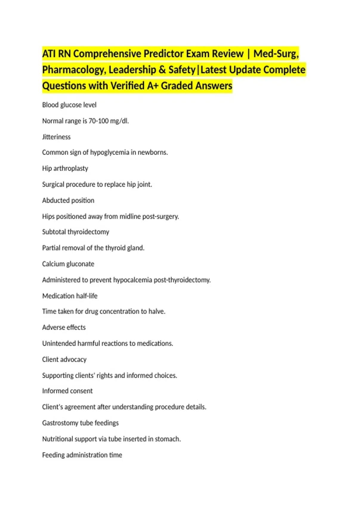 ATI RN Comprehensive Predictor Exam Review | Med-Surg, Pharmacology, Leadership & Safety|Latest Update Complete Questions with Verified A+ Graded Answers Blood glucose level Normal range is 70-100 mg/dl. Jitteriness Common sign of hypoglycemia in newborns. Hip arthroplasty Surgical procedure to replace hip joint. Abducted position Hips positioned away from midline post-surgery. Subtotal thyroidectomy Partial removal of the thyroid gland. Calcium gluconate Administered to prevent hypocalcemia post-thyroidectomy. Medication half-life Time taken for drug concentration to halve. Adverse effects Unintended harmful reactions to medications. Client advocacy Supporting clients' rights and informed choices. Informed consent Client's agreement after understanding procedure details. Gastrostomy tube feedings Nutritional support via tube inserted in stomach. Feeding administration time Recommended duration is 30 minutes for safety. Supine position Lying flat on back, often post-feeding. Digoxin Medication used to treat heart conditions. Apical pulse Heart rate measured at the apex of the heart. Sickle-cell anemia Genetic disorder affecting red blood cell shape. Acute chest syndrome Serious complication in sickle-cell anemia patients. Substernal retractions Indicates respiratory distress, requires immediate attention. Temperature 37.9 C Slight fever, may indicate infection. Potassium level Normal range is 3.5-5.0 mEq/L. Constipation Infrequent