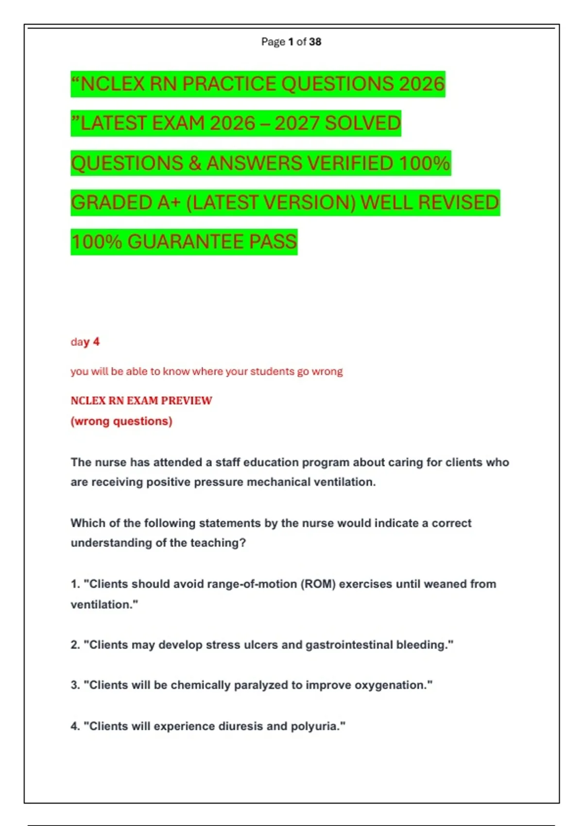 “NCLEX RN PRACTICE QUESTIONS 2026 ”LATEST EXAM 2026 – 2027 SOLVED QUESTIONS & ANSWERS VERIFIED 100% GRADED A+ (LATEST VERSION) WELL REVISED 100% GUARANTEE PASS