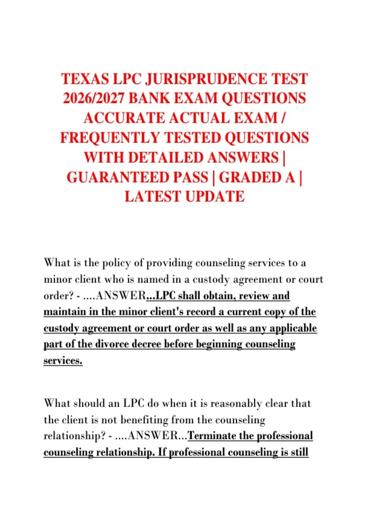 TEXAS LPC JURISPRUDENCE TEST 2026/2027 BANK EXAM QUESTIONS ACCURATE ACTUAL EXAM / FREQUENTLY TESTED QUESTIONS WITH DETAILED ANSWERS | GUARANTEED PASS | GRADED A | LATEST UPDATE