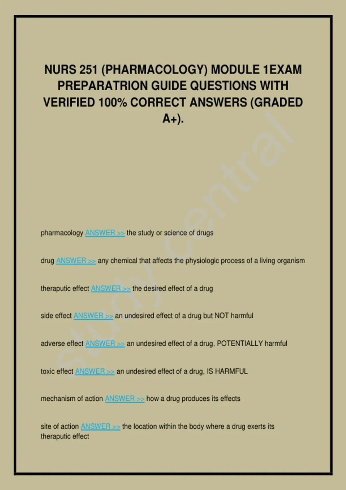 _____ INSTANT PDF DOWNLOAD ____ This document provides a complete exam preparation guide for NURS 251 Pharmacology Module 1, featuring carefully selected exam-style questions with verified, accurate answers. It covers the core foundational pharmacology concepts required for Module 1 and is structured to support efficient study and exam success with confidence.
