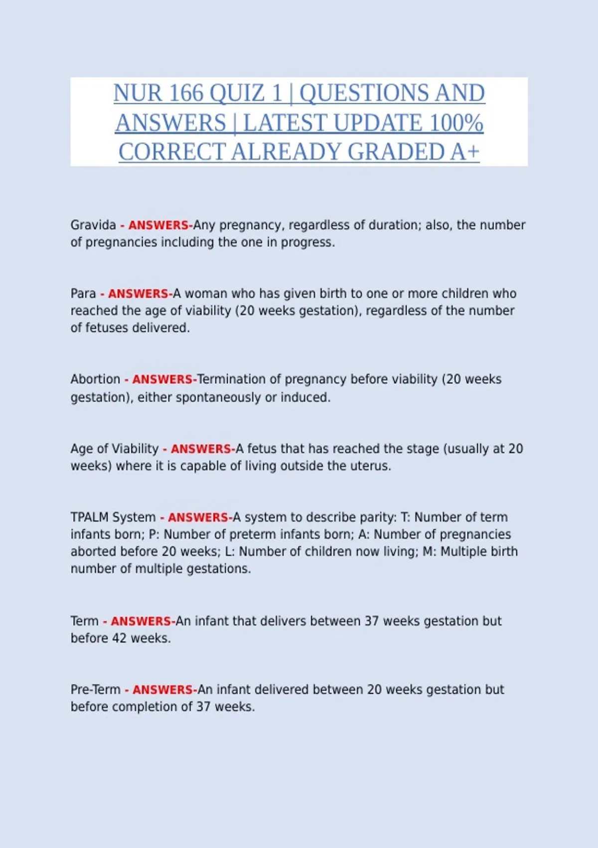 Para - ANSWERS-A woman who has given birth to one or more children who