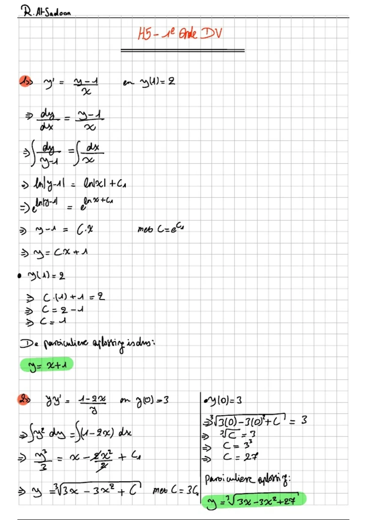 In dit document worden alle oefeningen van de cursus wiskundige methoden en technieken, hoofdstuk 5 1e orde differentiaal vergelijkingen volledig uitgewerkt.
