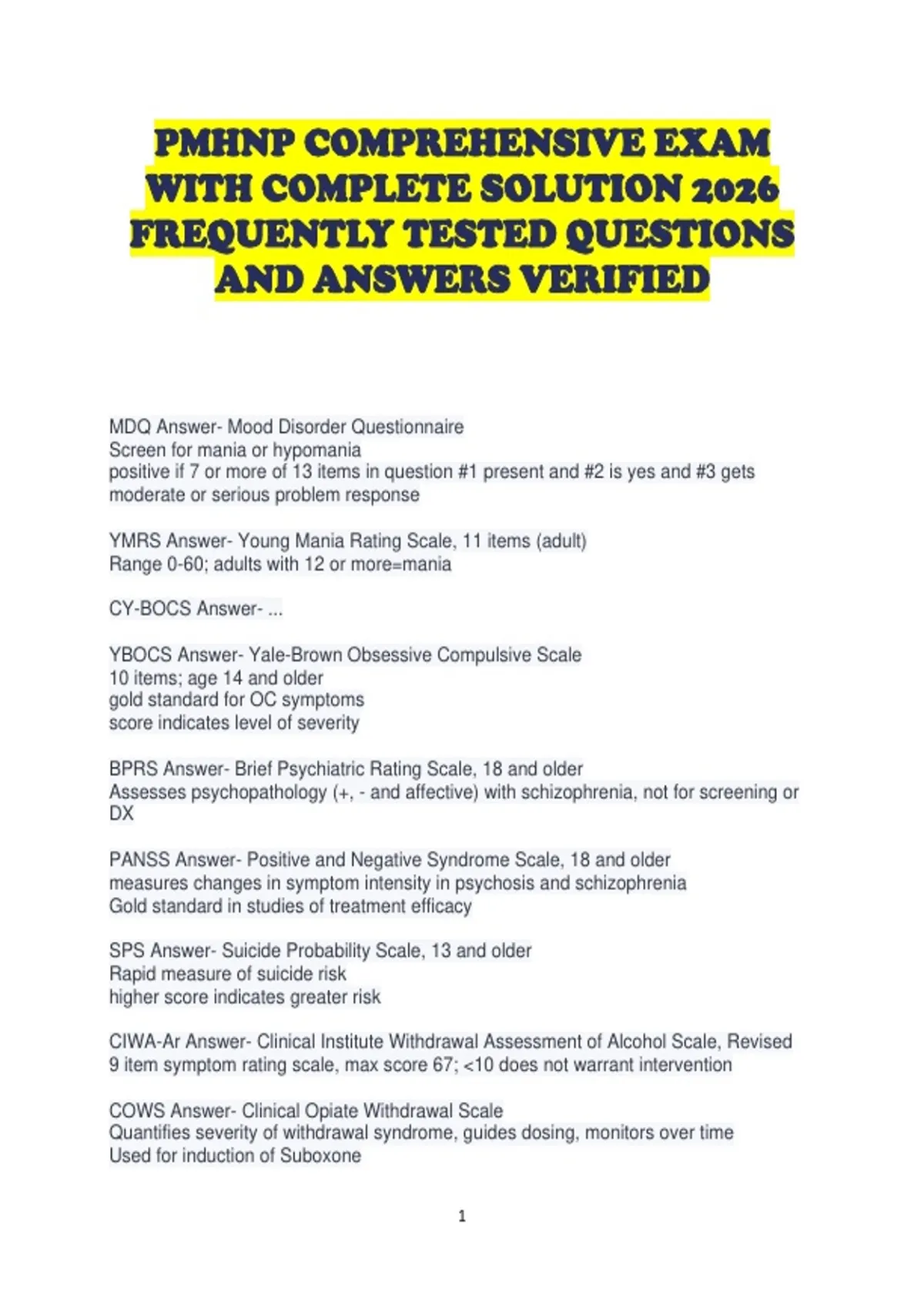 PMHNP COMPREHENSIVE EXAM WITH COMPLETE SOLUTION 2026 FREQUENTLY TESTED QUESTIONS AND ANSWERS VERIFIED