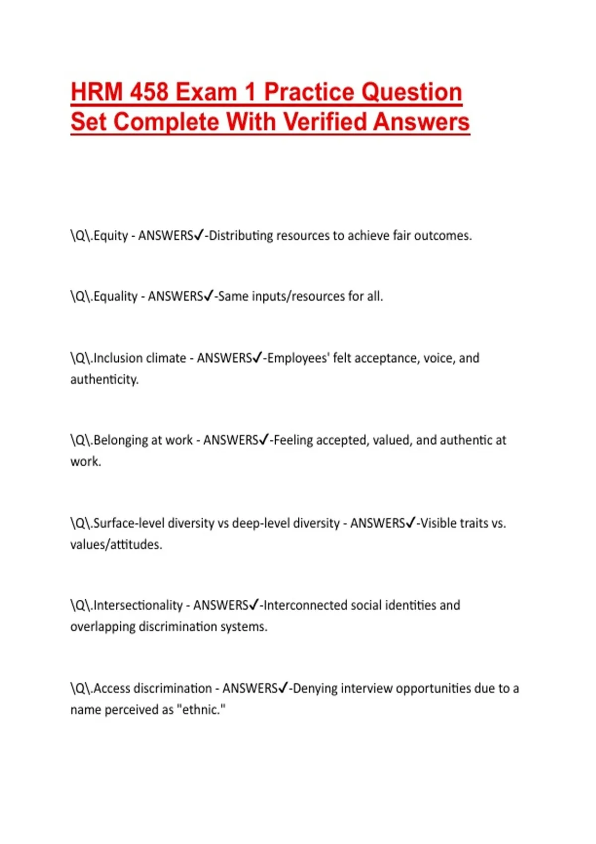 HRM 458 Exam 1 Practice Question Set Complete With Verified Answers Q.Equity - ANSWERS-Distributing resources to achieve fair outcomes. Q.Equality - ANSWERS-Same inputs/resources for all. Q.Inclusion climate - ANSWERS-Employees' felt acceptance, voice, and authenticity. Q.Belonging at work - ANSWERS-Feeling accepted, valued, and authentic at work. Q.Surface-level diversity vs deep-level diversity - ANSWERS-Visible traits vs. values/attitudes. Q.Intersectionality - ANSWERS-Interconnected social identities and overlapping discrimination systems. Q.Access discrimination - ANSWERS-Denying interview opportunities due to a name perceived as "ethnic." Q.Treatment discrimination - ANSWERS-Manager gives fewer client leads to equally qualified Latina analyst. Q.Disparate treatment under Title VII - ANSWERS-Different treatment because of protected class membership. Q.Disparate impact under Title VII - ANSWERS-A neutral rule that creates adverse effects on a protected group. Q.Herring's research findings - ANSWERS-Greater race/gender diversity is associated with increased sales, customers, market share, and profits. Q.Holmes et al. (2020) findings - ANSWERS-Organizations should emphasize inclusion climate to drive outcomes. Q.English-only rule - ANSWERS-Most defensible when used for customer interactions when safety/efficiency requires a common language. Q.English-only at all times - ANSWERS-Most likely violates EEOC guidance. Q.Codeswitching - ANSWERS-Mirroring dominant-group norms to be seen as professional. Q.Microaggressions - ANSWERS-Brief, everyday slights that can communicate hostility toward marginalized groups.