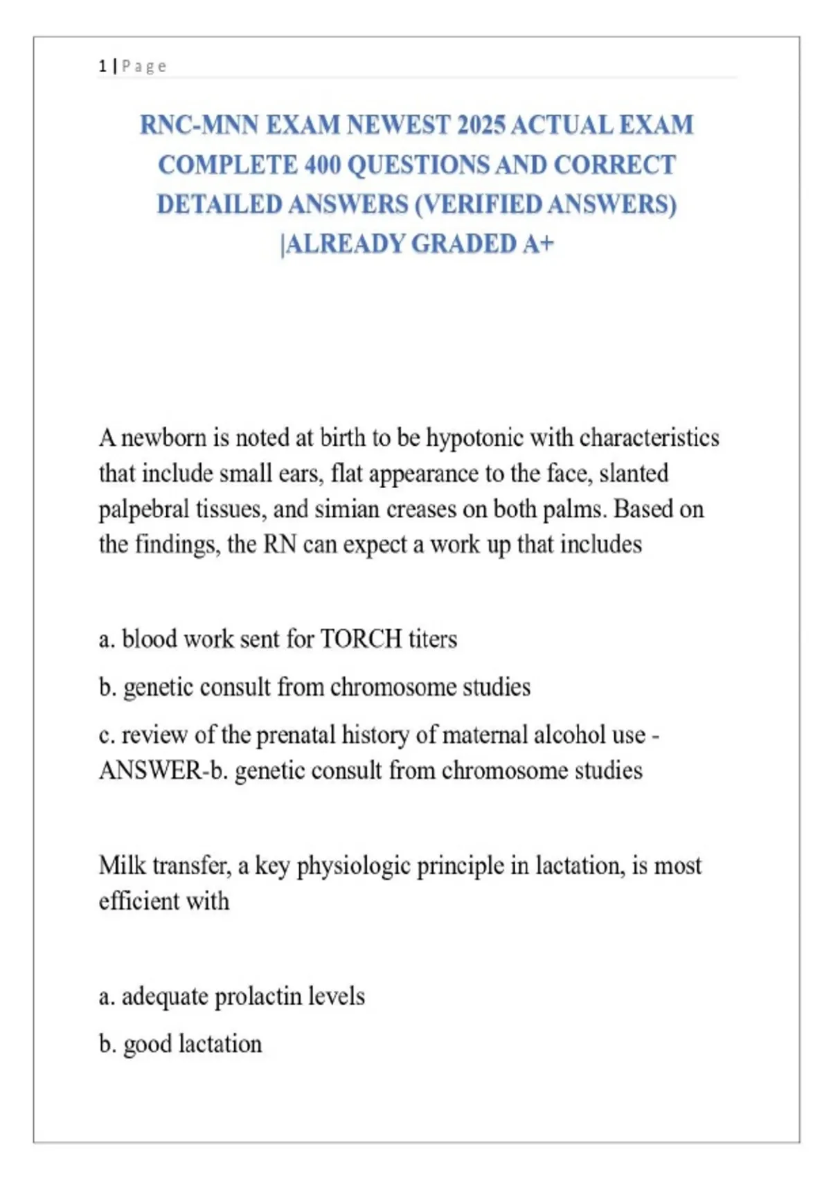 RNC-MNN® Maternal Newborn Nursing Exam-Aligned Practice & Review Pack (2025 Edition) Extensive Question Set | Multiple Versions | Answers & Detailed Rationales Included Prepare confidently for the RNC-MNN (Maternal Newborn Nursing) certification exam with this comprehensive, exam-aligned practice and review pack, designed to reflect the content areas, clinical judgment expectations, and question style commonly encountered on modern maternal-newborn nursing exams. This resource provides a large, in-depth collection of original practice questions written to support nurses seeking certification by strengthening clinical knowledge, critical thinking, and test-taking confidence. Designed for Serious RNC-MNN Exam Preparation The RNC-MNN exam evaluates advanced understanding of: Maternal physiological changes Intrapartum and postpartum nursing care Newborn assessment and stabilization Complications and high-risk scenarios Evidence-based maternal-newborn practice This practice pack was created to support focused, ethical exam preparation by transforming complex maternal-newborn concepts into clear, exam-ready application. Rather than memorization, the questions emphasize clinical reasoning, prioritization, and safe nursing judgment, aligning with professional certification expectations. What’s Included in This RNC-MNN Practice & Review Pack Extensive Exam-Style Question Collection A large question bank designed to support in-depth review across all major RNC-MNN content domains. Multiple Practice Versions Questions are organized into multiple versions and sets, allowing repeated practice without memorizing answers. Original Exam-Aligned Questions All questions are newly written and aligned with maternal-newborn certification objectives — not copied from exams, review books, or proprietary test banks. Correct Answers Clearly Indicated Each question includes the correct answer for accurate self-assessment. Detailed, Educational Rationales Rationales explain: The correct clinical reasoning Relevant maternal-newborn physiology Why alternative options are incorrect Key exam-relevant takeaways Balanced Difficulty Levels Includes moderate to advanced questions appropriate for experienced maternal-newborn nurses preparing for certification. Core Content Areas Covered This exam-aligned review pack provides comprehensive coverage of high-yield RNC-MNN topics, including: Antepartum Care Physiologic adaptations of pregnancy Fetal growth and development Prenatal assessment and screening Common pregnancy discomforts High-risk conditions (e.g., hypertension, diabetes) Intrapartum Care Labor physiology and stages of labor Fetal monitoring and interpretation Pain management and labor support Normal and abnormal labor patterns Obstetric interventions and complications Postpartum Care Maternal physiologic changes Postpartum assessment Hemorrhage recognition and management Infection prevention Emotional adaptation and mental health Newborn Care Normal newborn adaptation Initial assessment and stabilization Thermoregulation Feeding and nutrition Common newborn complications High-Risk Maternal Conditions Preeclampsia and eclampsia Gestational diabetes Hemorrhagic disorders Infection and sepsis Cardiopulmonary complications High-Risk Neonatal Conditions Respiratory distress Hypoglycemia Hyperbilirubinemia Prematurity and post-term infants Congenital anomalies Pharmacology in Maternal-Newborn Care Common obstetric medications Tocolytics and uterotonics Analgesics and anesthetics Neonatal medication considerations Ethical, Cultural, and Professional Issues Patient education Family-centered care Cultural considerations Legal and ethical responsibilities Evidence-based practice