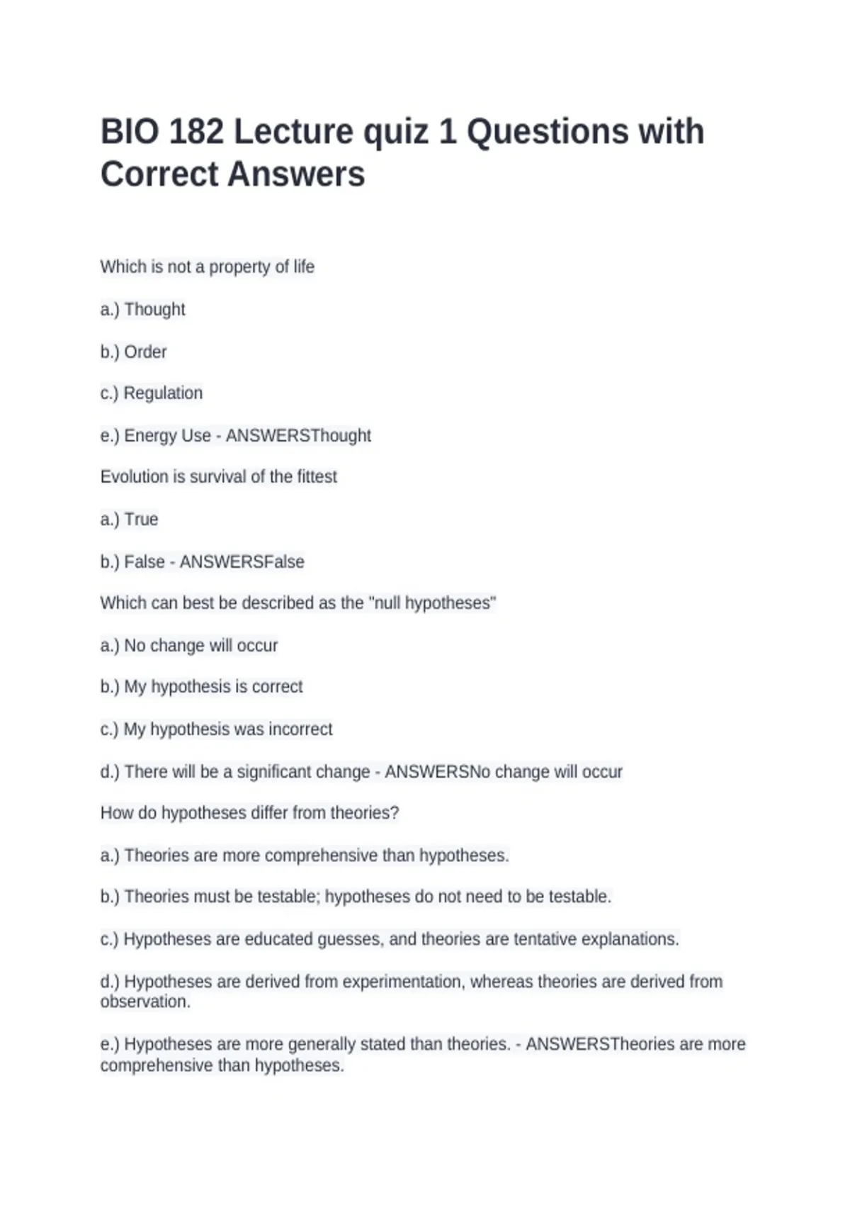 Which is not a property of life a.) Thought b.) Order c.) Regulation e.) Energy Use - ANSWERSThought Evolution is survival of the fittest a.) True b.) False - ANSWERSFalse Which can best be described as the "null hypotheses" a.) No change will occur b.) My hypothesis is correct c.) My hypothesis was incorrect d.) There will be a significant change - ANSWERSNo change will occur How do hypotheses differ from theories? a.) Theories are more comprehensive than hypotheses. b.) Theories must be testable; hypotheses do not need to be testable. c.) Hypotheses are educated guesses, and theories are tentative explanations. d.) Hypotheses are derived from experimentation, whereas theories are derived from observation. e.) Hypotheses are more generally stated than theories. - ANSWERSTheories are more comprehensive than hypotheses.