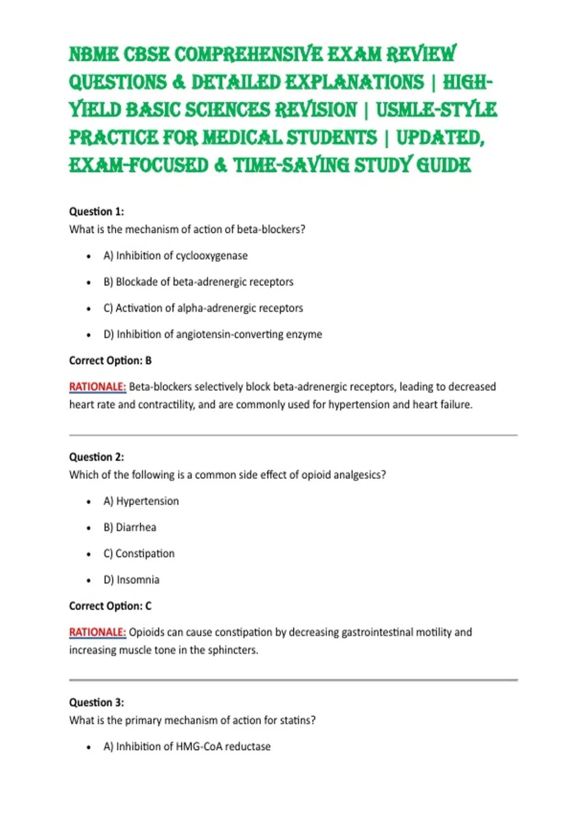 This NBME CBSE comprehensive revision document is a high-yield, exam-oriented study guide designed specifically to help medical students excel in the Comprehensive Basic Science Examination (CBSE). It features USMLE-style practice questions with clear, step-by-step explanations, strong clinical correlations, and focused coverage of core basic science subjects tested in the NBME CBSE. The content is well-structured, easy to revise, and optimized for last-minute preparation, making it ideal for students aiming to strengthen weak areas, improve question-analysis skills, and boost overall scores. Whether you are preparing for CBSE, NBME assessments, or USMLE Step-style exams, this document saves time, enhances understanding, and delivers exactly what examiners expect—making it a must-have resource for serious medical students.