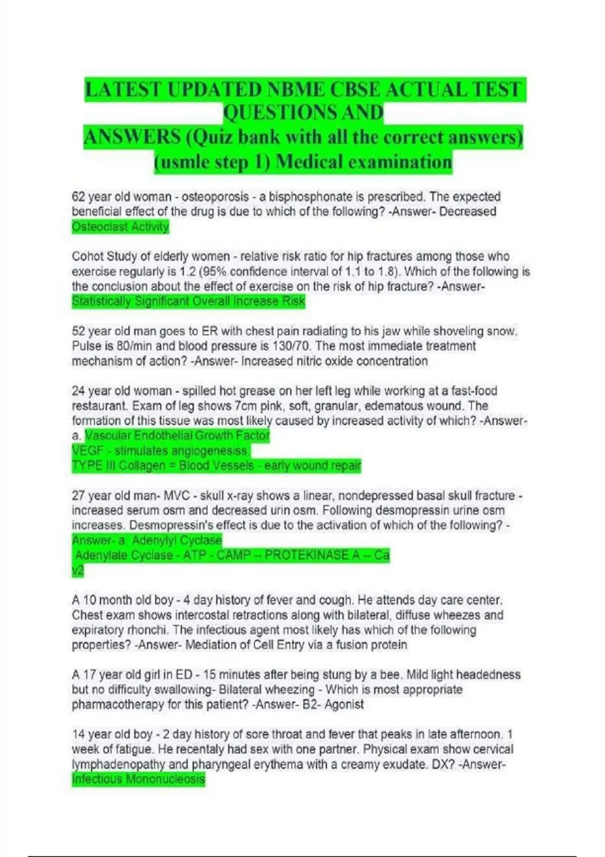 NBME CBSE–STYLE PRACTICE QUESTION BANK Comprehensive Quiz Bank with Answer Keys & Explanations Latest Updated Edition | USMLE Step 1–Aligned Review Prepare effectively for the NBME CBSE (Comprehensive Basic Science Exam) and USMLE Step 1–style assessments with this comprehensive, exam-aligned practice question bank designed to strengthen foundational science knowledge, improve clinical reasoning, and assess readiness for high-stakes medical examinations. This resource features original, NBME-style practice questions written to closely reflect the format, integration, and cognitive level commonly assessed on CBSE and USMLE Step 1 exams. Each question is paired with clearly identified correct answers and focused explanations, allowing learners to review efficiently while reinforcing high-yield concepts across all basic science disciplines. Whether you are preparing for a school-administered CBSE, a USMLE Step 1 readiness assessment, or structured board review, this quiz bank serves as a reliable, ethical, and effective study companion. Designed for CBSE & USMLE Step 1 Readiness The NBME CBSE and USMLE Step 1 exams emphasize integrated basic science knowledge and the ability to apply it to clinical vignettes. This question bank is structured to help learners practice: Interpreting integrated clinical scenarios Applying foundational science concepts to patient cases Recognizing mechanisms of disease Linking pathology, pharmacology, and physiology Prioritizing key details in long question stems The goal is not memorization—but conceptual understanding and clinical application, which are critical for Step 1-level success. What’s Included in This Quiz Bank Extensive Set of Original Practice Questions Questions are newly written and aligned with NBME/USMLE Step 1 testing style. Correct Answers Clearly Marked Each question includes the correct answer for self-assessment and review. Concise, High-Yield Explanations Rationales focus on: Core mechanisms and principles Why the correct answer is best Key associations tested on boards Integrated Clinical Vignettes Most questions are case-based, reflecting real exam structure. Updated to Current Step 1 Expectations Content reflects modern emphasis on integration, reasoning, and mechanisms.