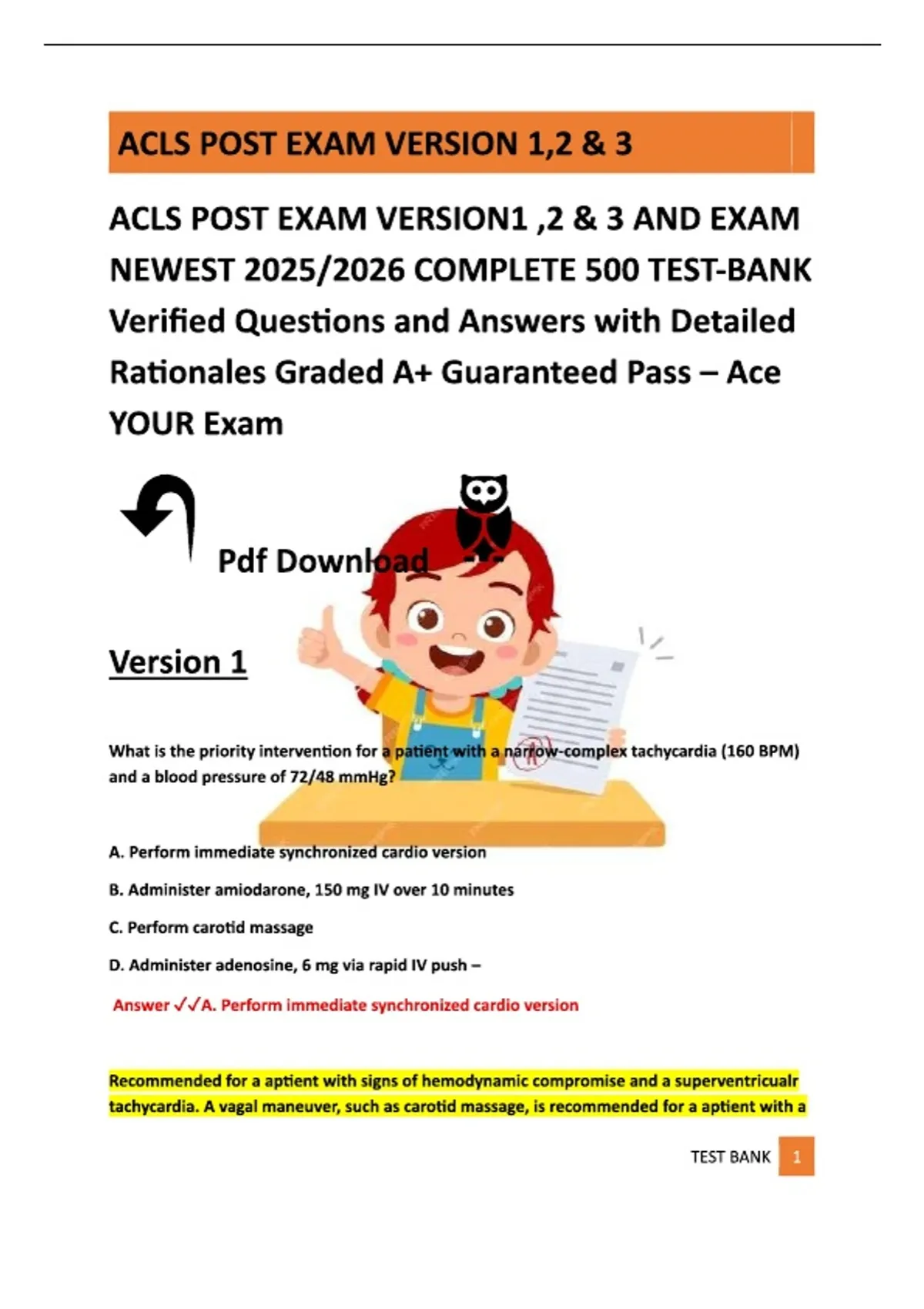 ACLS POST EXAM VERSION1 ,2 & 3 AND EXAM NEWEST 2025/2026 COMPLETE 500 TEST-BANK Verified Questions and Answers with Detailed Rationales Graded A+ Guaranteed Pass – Ace YOUR Exam