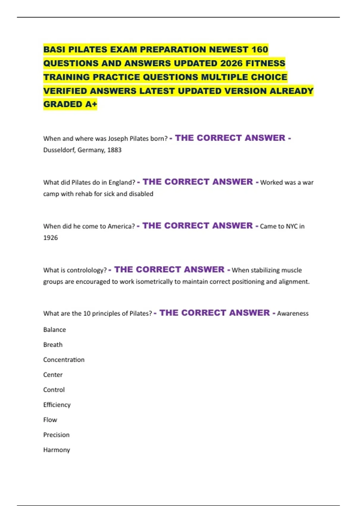 BASI PILATES EXAM PREPARATION NEWEST 160 QUESTIONS AND ANSWERS UPDATED 2026 FITNESS TRAINING PRACTICE QUESTIONS MULTIPLE CHOICE VERIFIED ANSWERS LATEST UPDATED VERSION ALREADY GRADED A+ When and where was Joseph Pilates born? - THE CORRECT ANSWER - Dusseldorf, Germany, 1883 What did Pilates do in England? - THE CORRECT ANSWER - Worked was a war camp with rehab for sick and disabled When did he come to America? - THE CORRECT ANSWER - Came to NYC in 1926 What is controlology? - THE CORRECT ANSWER - When stabilizing muscle groups are encouraged to work isometrically to maintain correct positioning and alignment. What are the 10 principles of Pilates? - THE CORRECT ANSWER - Awareness Balance Breath Concentration Center Control Efficiency Flow Precision Harmony (all bad bitches can call Christy especially for precision and harmony) When are you in neutral pelvis? - THE CORRECT ANSWER - When the ASIS and pubic symphysis is on the same horizontal plane and two ASIS are on the same transverse plane