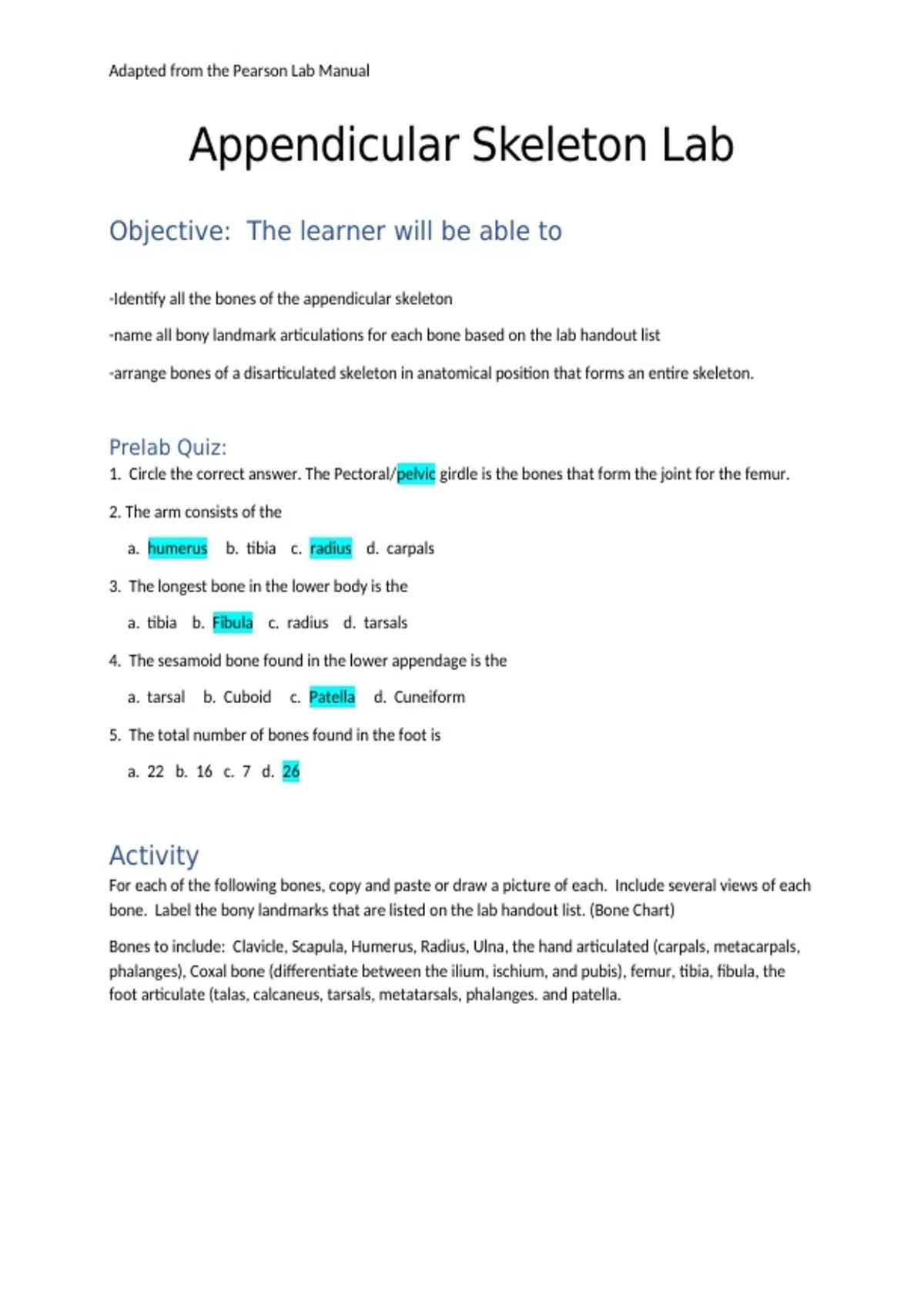 Appendicular Skeleton Post Lab Activity 2026/2027