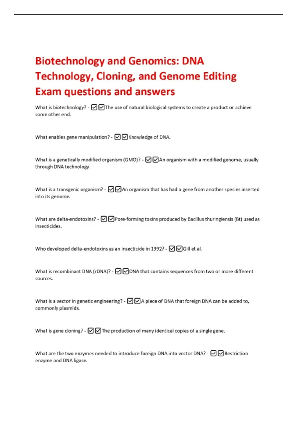 Biotechnology and Genomics: DNA Technology, Cloning, and Genome Editing Exam questions and answers