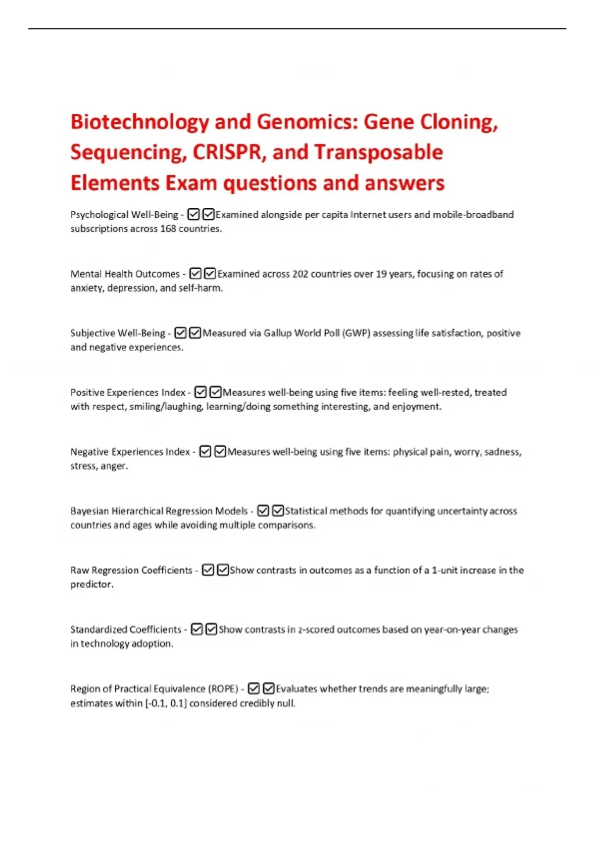 Biotechnology and Genomics: Gene Cloning, Sequencing, CRISPR, and Transposable Elements Exam questions and answers Psychological Well-Being - Examined alongside per capita Internet users and mobile-broadband subscriptions across 168 countries. Mental Health Outcomes - Examined across 202 countries over 19 years, focusing on rates of anxiety, depression, and self-harm. Subjective Well-Being - Measured via Gallup World Poll (GWP) assessing life satisfaction, positive and negative experiences.