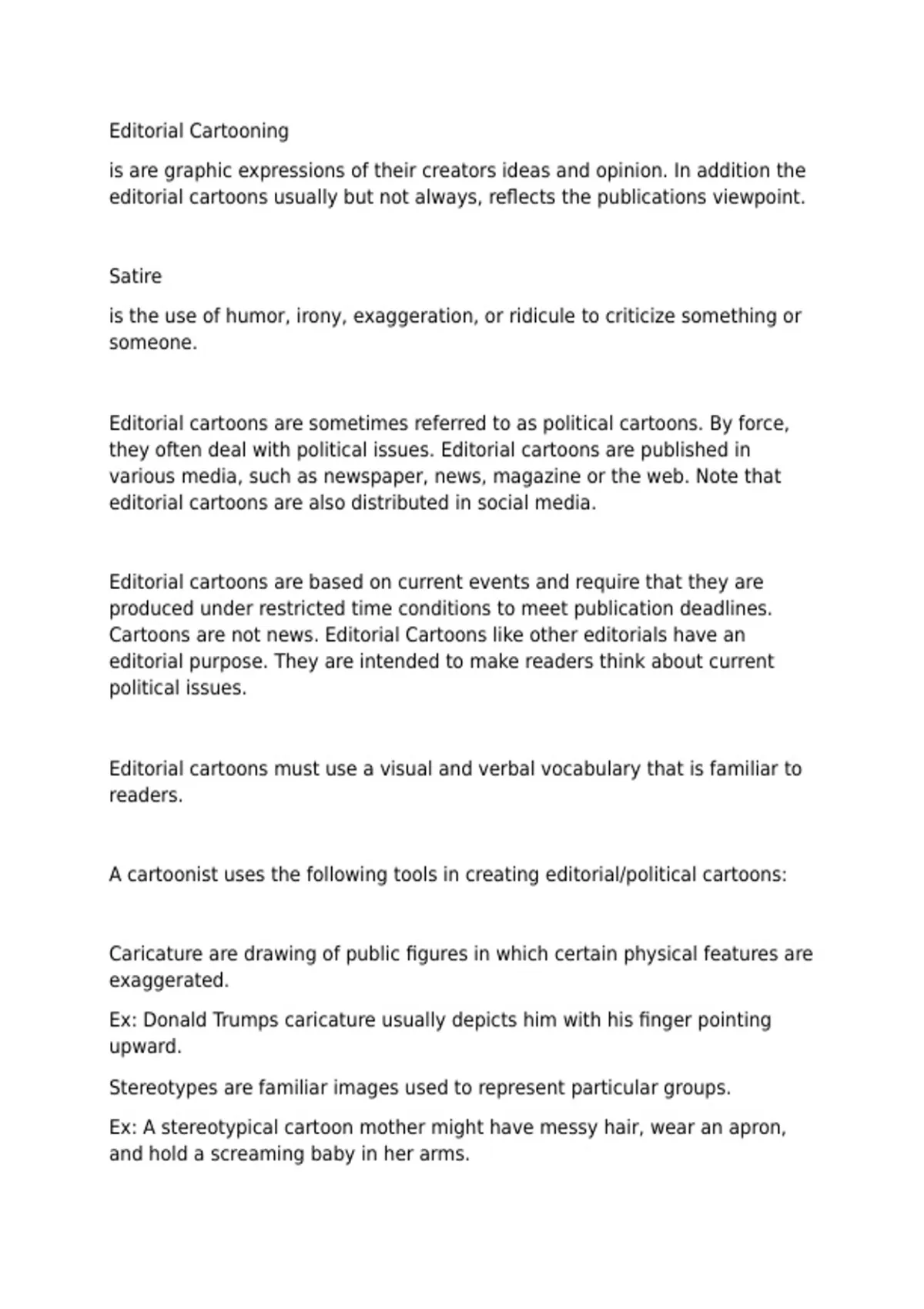 A cartoonist uses the following tools in creating editorial/political cartoons: