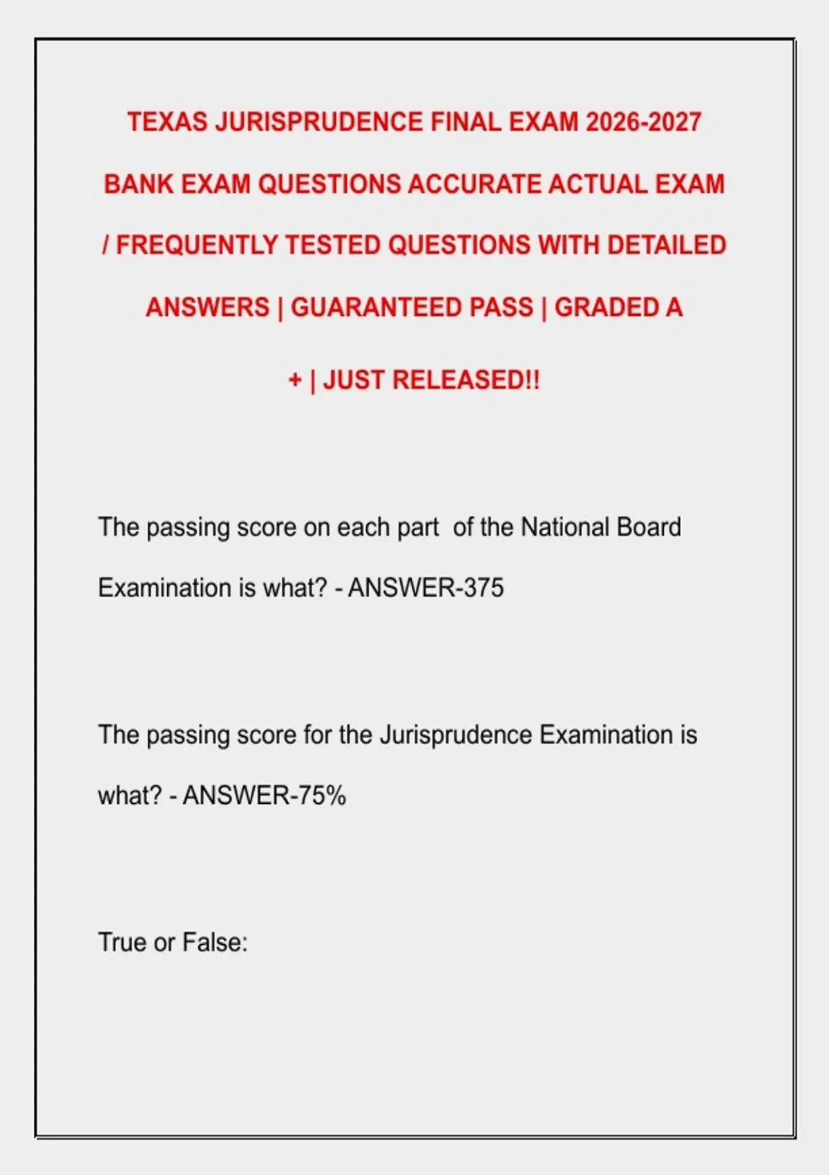 TEXAS JURISPRUDENCE FINAL EXAM BANK EXAM QUESTIONS ACCURATE ACTUAL EXAM / FREQUENTLY TESTED QUESTIONS WITH DETAILED ANSWERS | GUARANTEED PASS | GRADED A + | JUST RELEASED!!