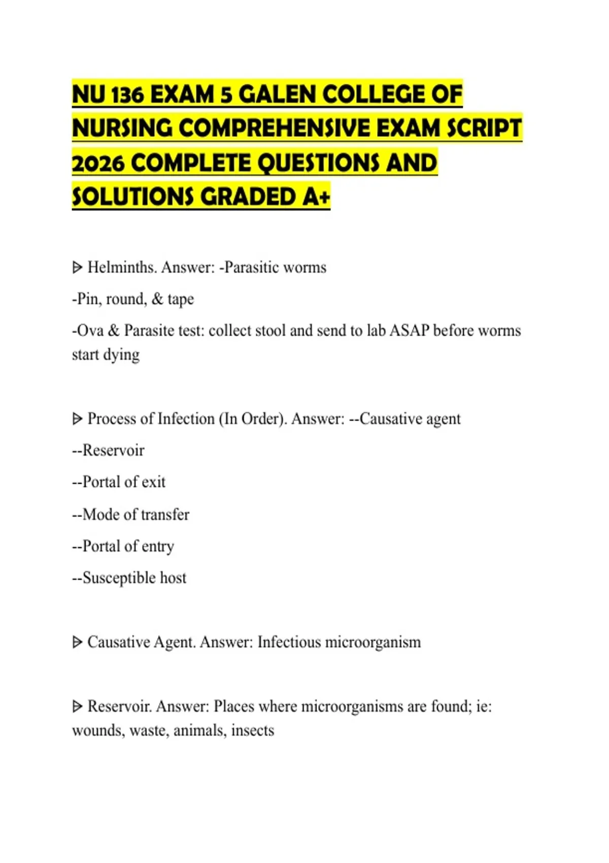 NU 136 EXAM 5 GALEN COLLEGE OF NURSING COMPREHENSIVE EXAM SCRIPT 2026 COMPLETE QUESTIONS AND SOLUTIONS GRADED A+