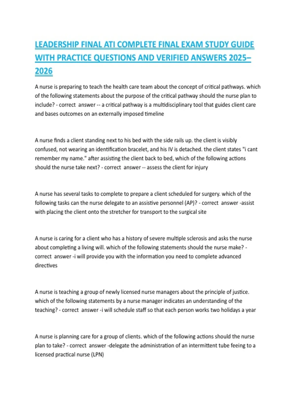 LEADERSHIP FINAL ATI COMPLETE FINAL EXAM STUDY GUIDE