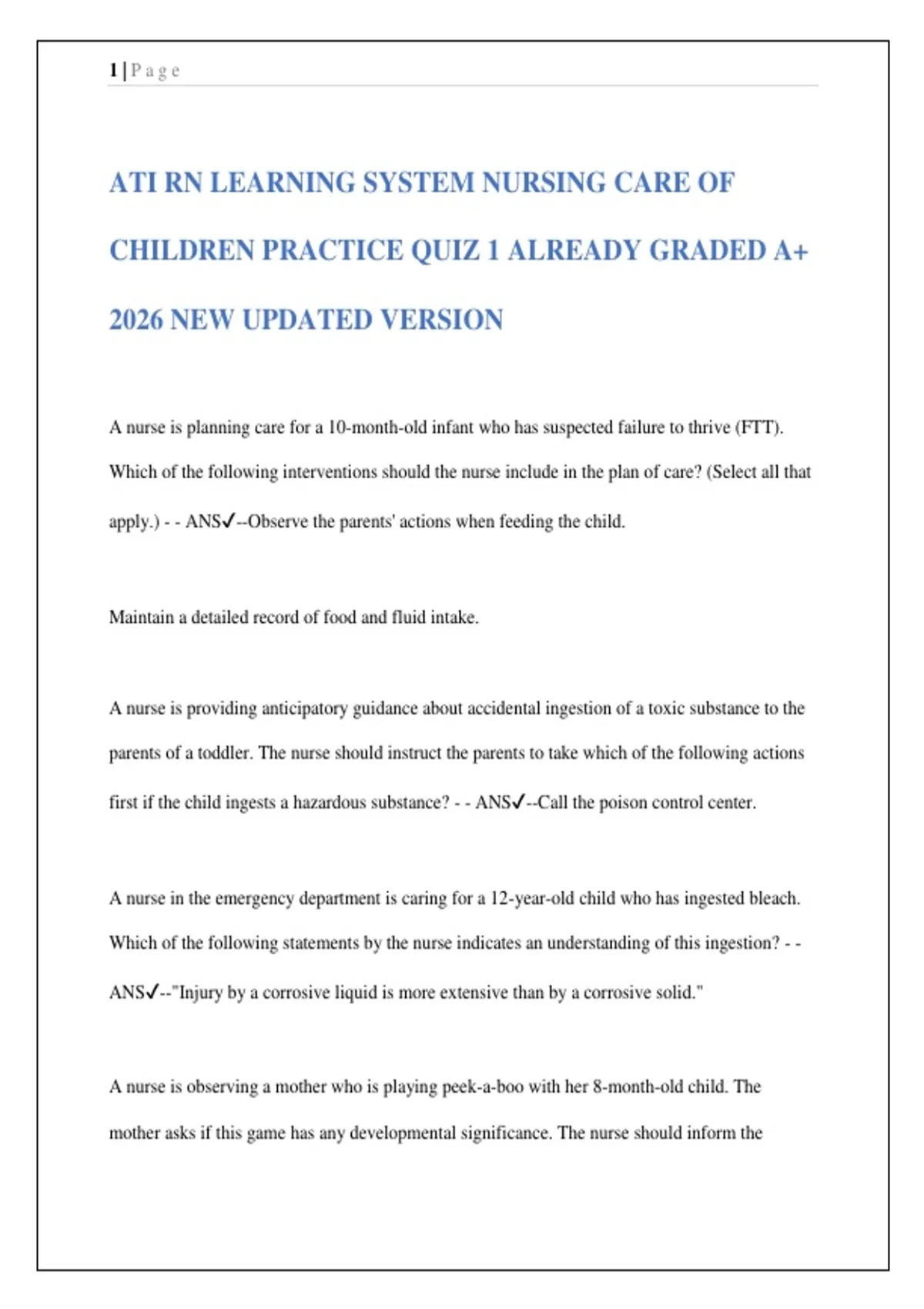 CHILDREN PRACTICE QUIZ 1 ALREADY GRADED A+