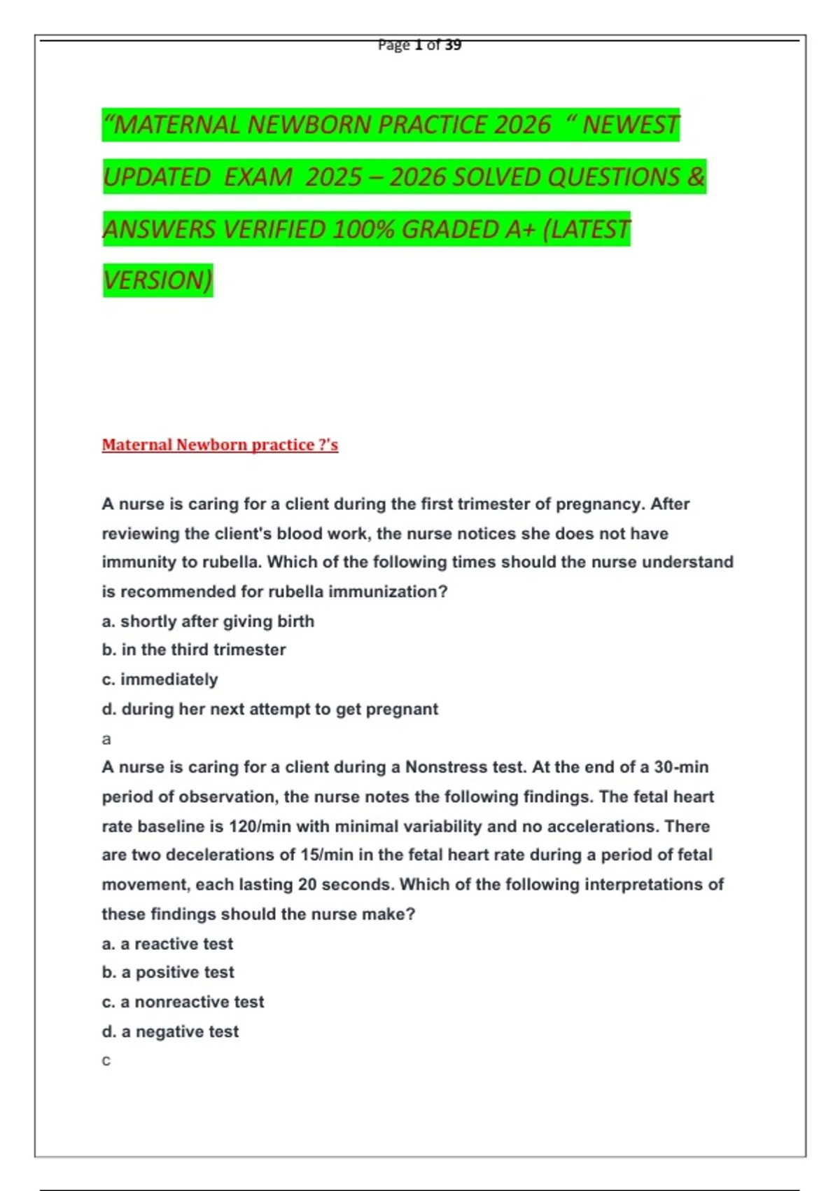 “MATERNAL NEWBORN PRACTICE 2026 “ NEWEST