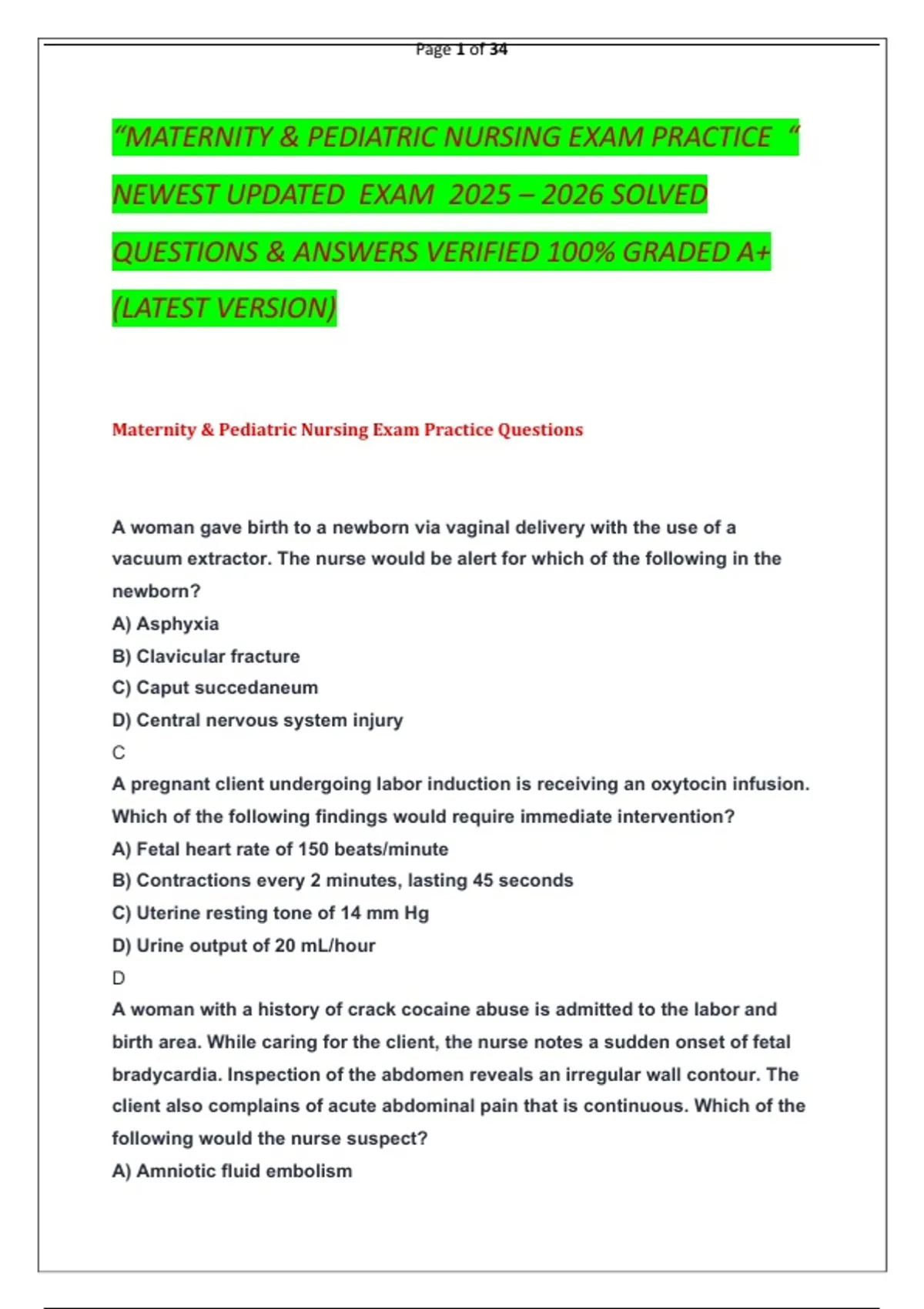 “MATERNITY & PEDIATRIC NURSING EXAM PRACTICE “ NEWEST UPDATED EXAM 2025 – 2026 SOLVED QUESTIONS & ANSWERS VERIFIED 100% GRADED A+ (LATEST VERSION)