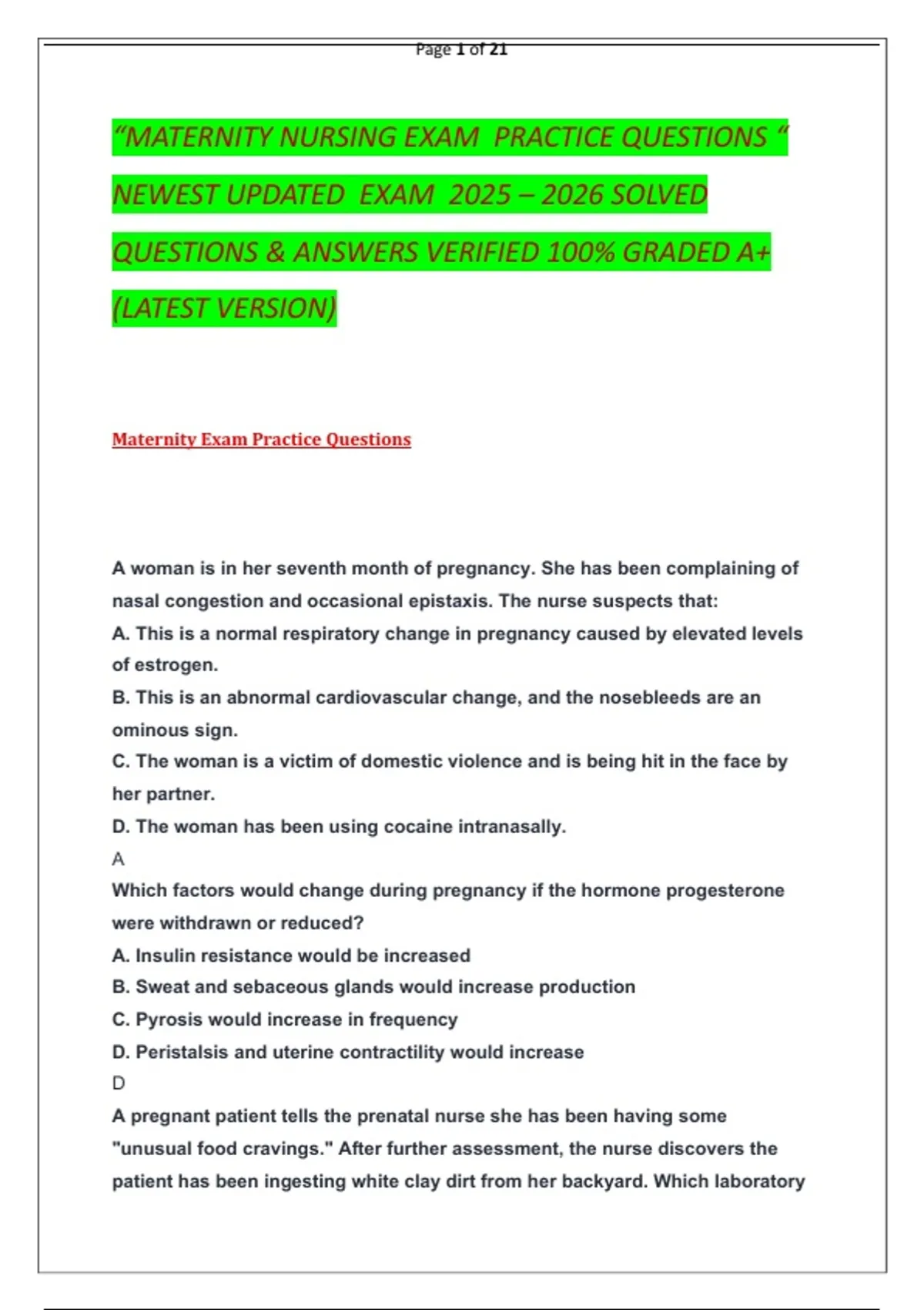 “MATERNITY NURSING EXAM PRACTICE QUESTIONS “