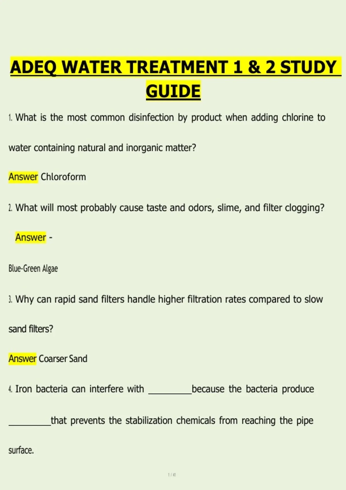 1. What is the most common disinfection by product when adding chlorine to