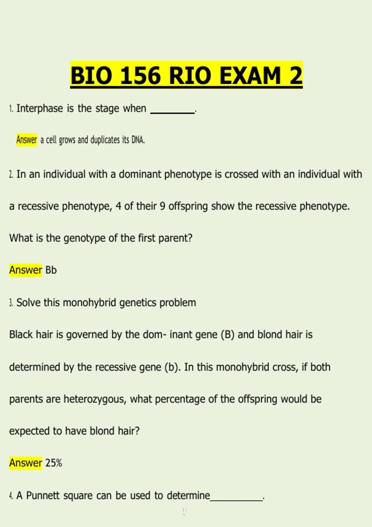 This comprehensive study guide for BIO 156 Exam 2 at Rio Salado College provides a detailed review of all essential topics covered in the course, helping students excel in their assessment. The guide covers core biology concepts such as cell division (mitosis and meiosis), inheritance patterns, Mendelian genetics, DNA structure and replication, protein synthesis, and gene expression. It also includes sections on evolutionary biology, natural selection, and an introduction to ecology, depending on the course scope. Each topic is explained in clear, easy-to-understand language, supplemented with practice questions and fully verified answers that mirror the style of Rio Salado exams. Designed for both self-study and group review, this guide allows students to reinforce their understanding, identify weak areas, and confidently prepare for BIO 156 Exam 2. With structured explanations, practical examples, and test-focused strategies, it is an essential resource for achieving top grades in Rio Salado College biology courses. BIO 156 Exam 2, Rio Salado College, Biology Study Guide, Genetics, Cell Division, DNA Replication, Protein Synthesis, Gene Expression, Evolution, Natural Selection, Ecology Basics, Rio Salado BIO 156 Exam Prep, College Biology Exam Review