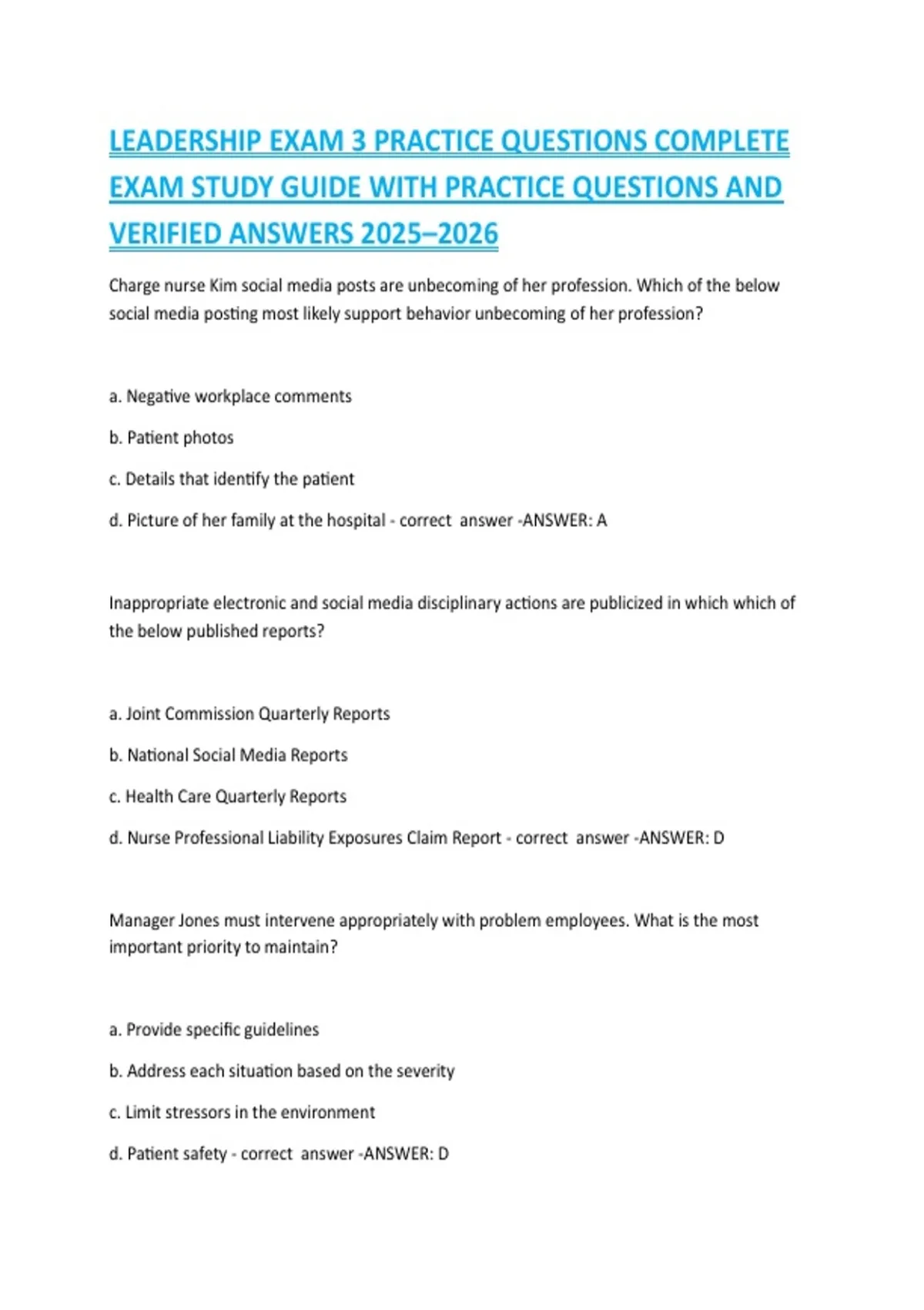 LEADERSHIP EXAM 3 PRACTICE QUESTIONS COMPLETE EXAM STUDY GUIDE WITH PRACTICE QUESTIONS AND VERIFIED ANSWERS 2025–2026