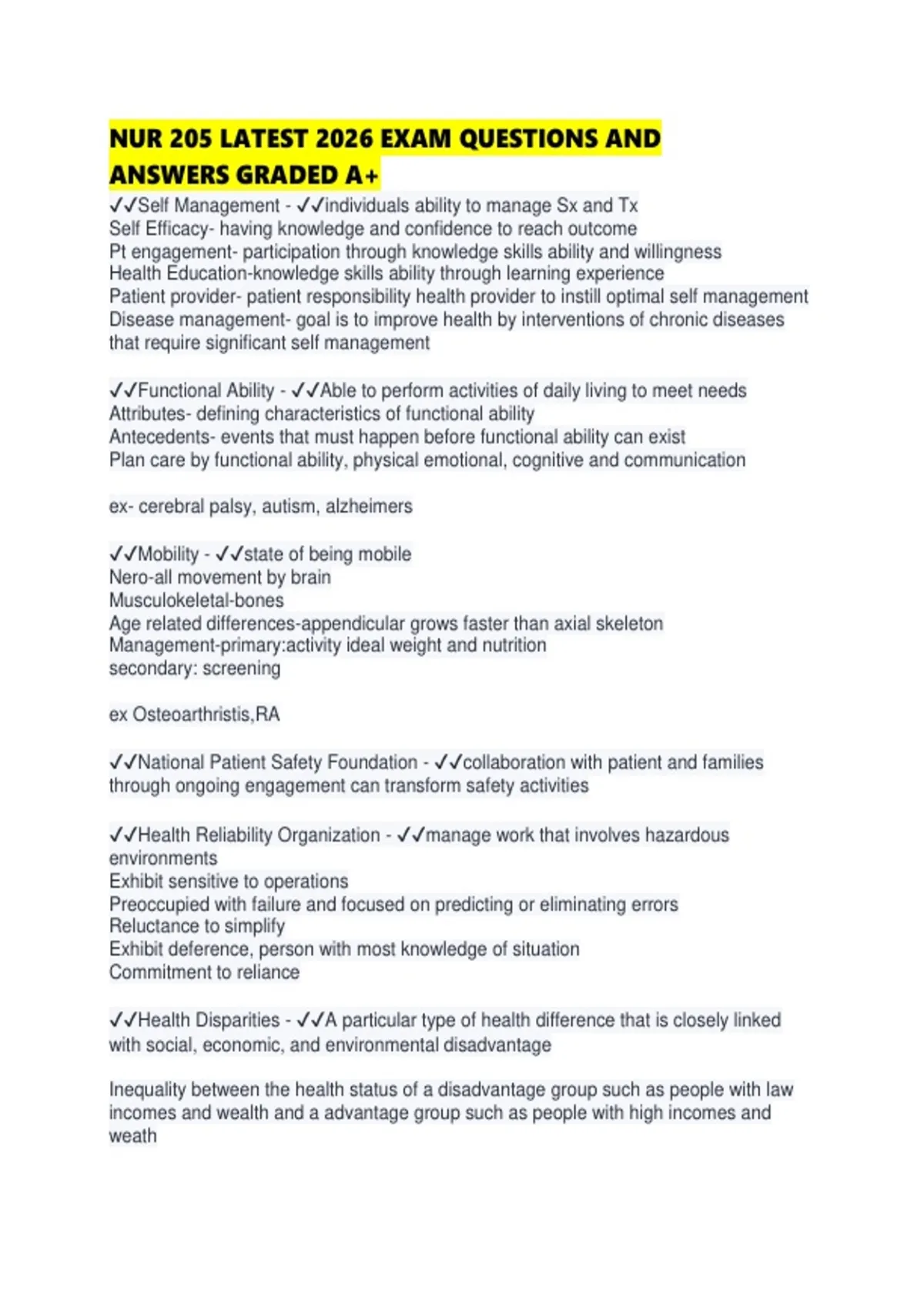 NUR 205 LATEST 2026 EXAM QUESTIONS AND ANSWERS GRADED