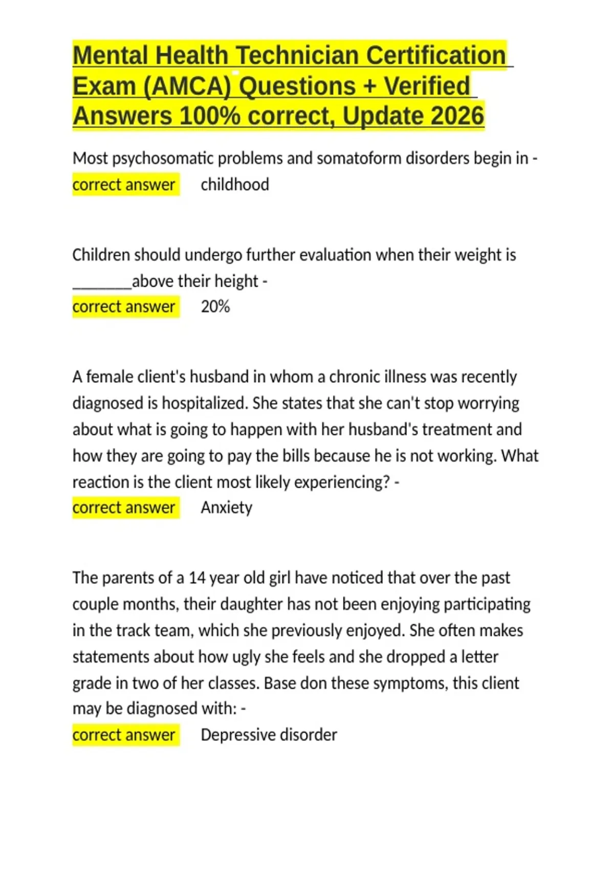 Mental Health Technician Certification Exam (AMCA) Questions + Verified Answers 100- correct, Update 2026.docx