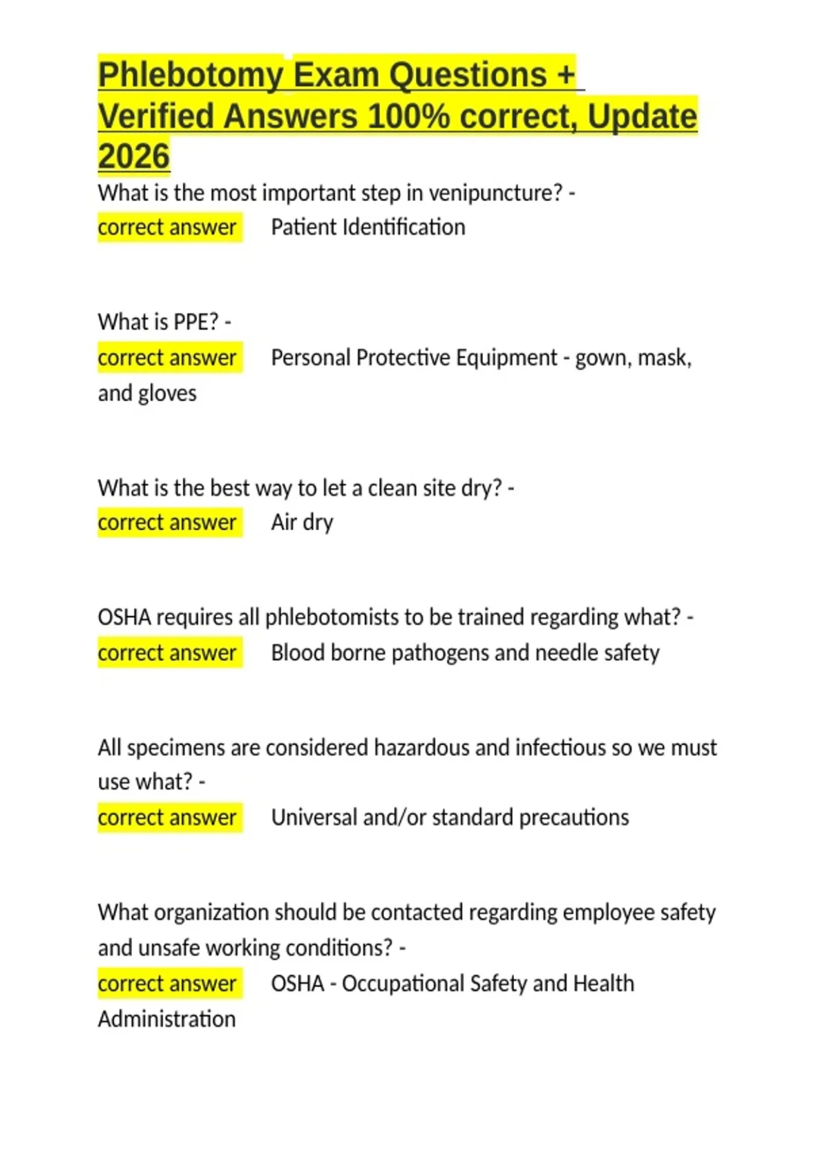 Phlebotomy Exam Questions + Verified Answers 100- correct, Update 2026.docx