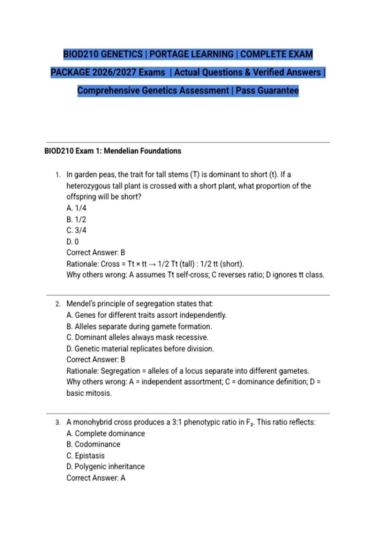 BIOD210 GENETICS | PORTAGE LEARNING | COMPLETE EXAM