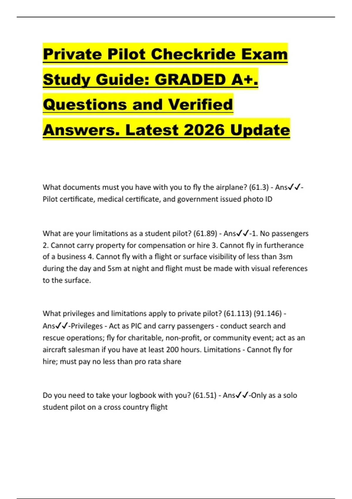 Private Pilot Checkride Exam Study Guide: GRADED A+. Questions and Verified Answers. Latest 2026 Update Private Pilot Checkride Exam Study Guide: GRADED A+. Questions and Verified Answers. Latest 2026 Update Private Pilot Checkride Exam Study Guide: GRADED A+. Questions and Verified Answers. Latest 2026 Update
