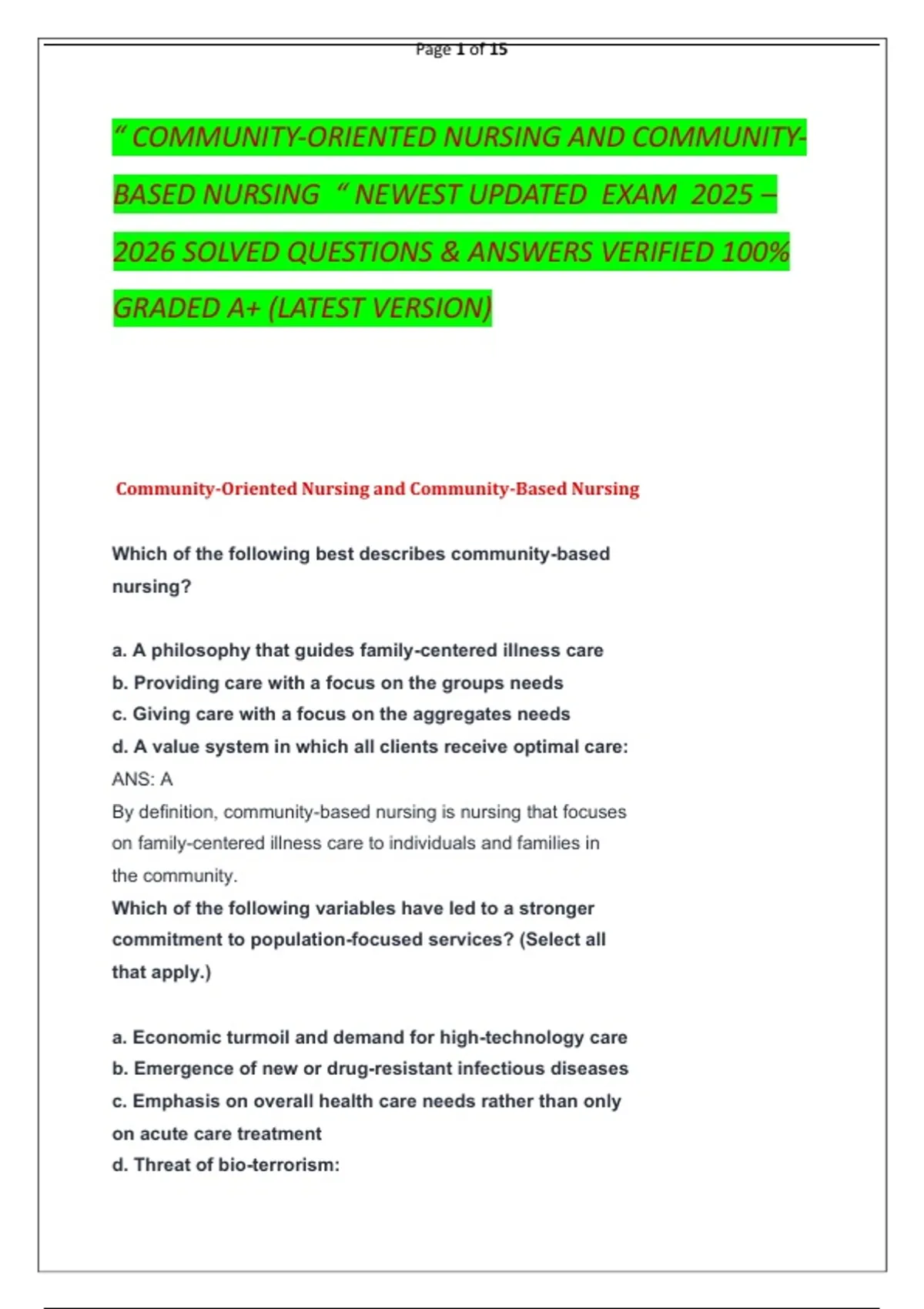 “ COMMUNITY-ORIENTED NURSING AND COMMUNITY BASED NURSING “ NEWEST UPDATED EXAM 2025 – 2026 SOLVED QUESTIONS & ANSWERS VERIFIED 100% GRADED A+ (LATEST VERSION)