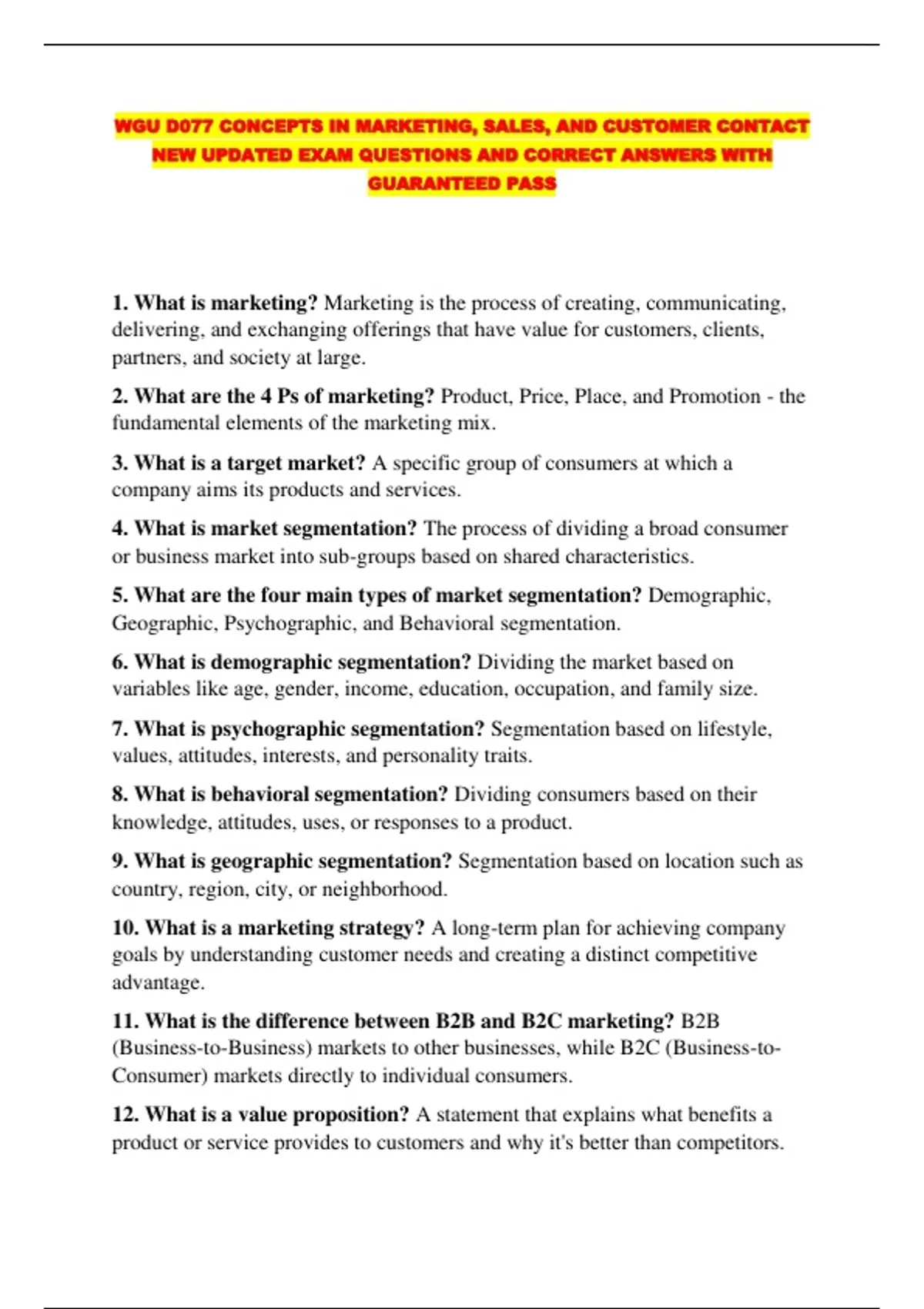 WGU D077 CONCEPTS IN MARKETING, SALES, AND CUSTOMER CONTACT